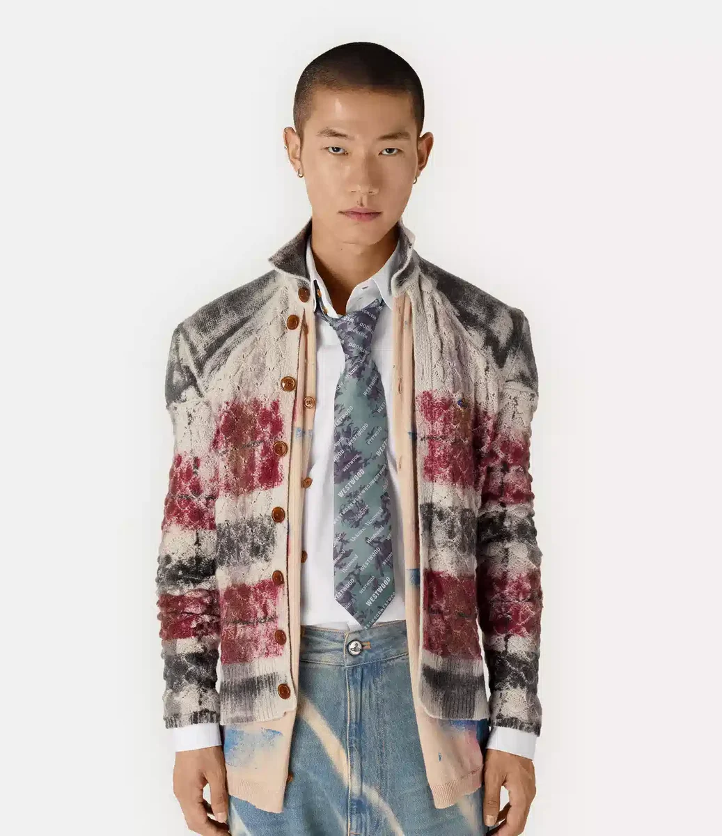 Our tie receives the signature Toile de Jouy print, offering a romantic pastoral motif across the design. Cut with a wide blade that tapers to a classic pointed tip, the piece is finished with bold ‘Westwood’ lettering motif repeated throughout the silhouette in varied fonts.