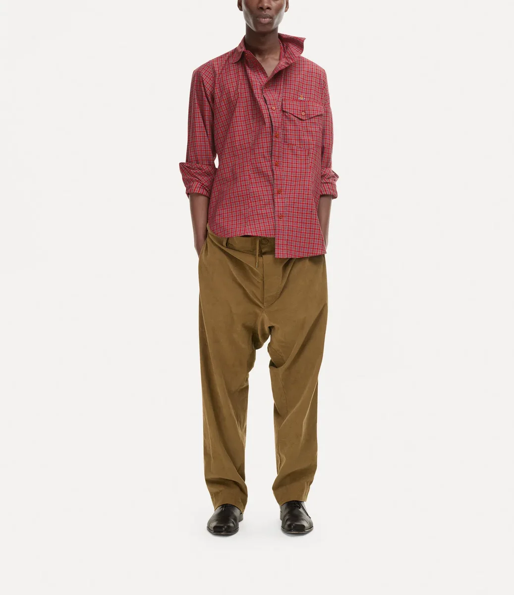The Chaos shirt revisits Vivienne’s experimental ‘Drunken’ tailoring system, characterised by asymmetric hem and an off-centre button placket. Crafted in a vibrant tartan check motif, the design is finished with multicoloured orb embroidery.