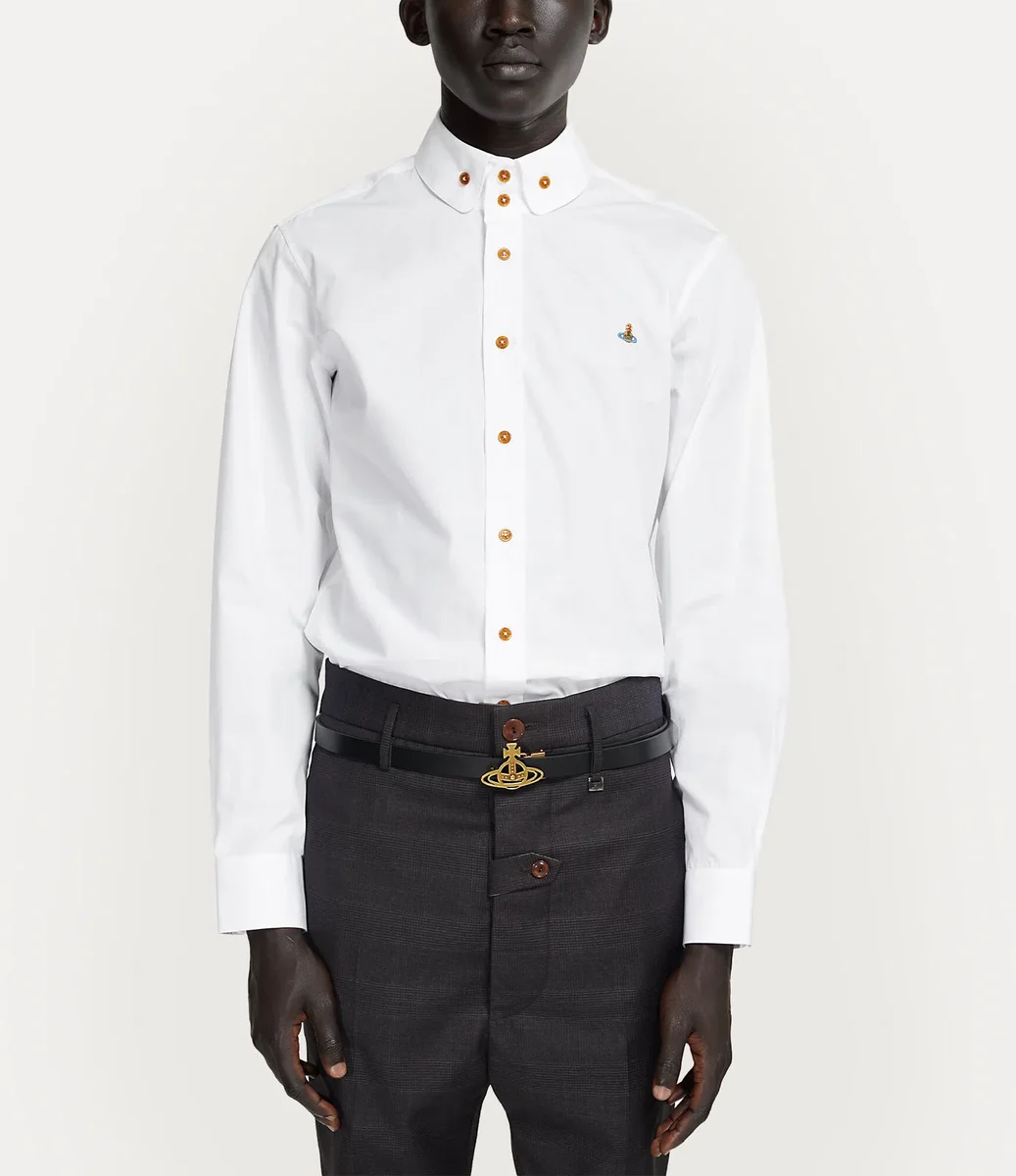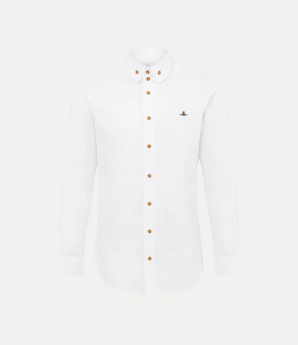 This season’s Two Button Krall shirt is inspired by an archive design, featuring the house’s distinctive two-button collar.The piece receives our signatureorb embroidery at the front of the design, representing Vivienne’s vision of launching tradition into the future.
