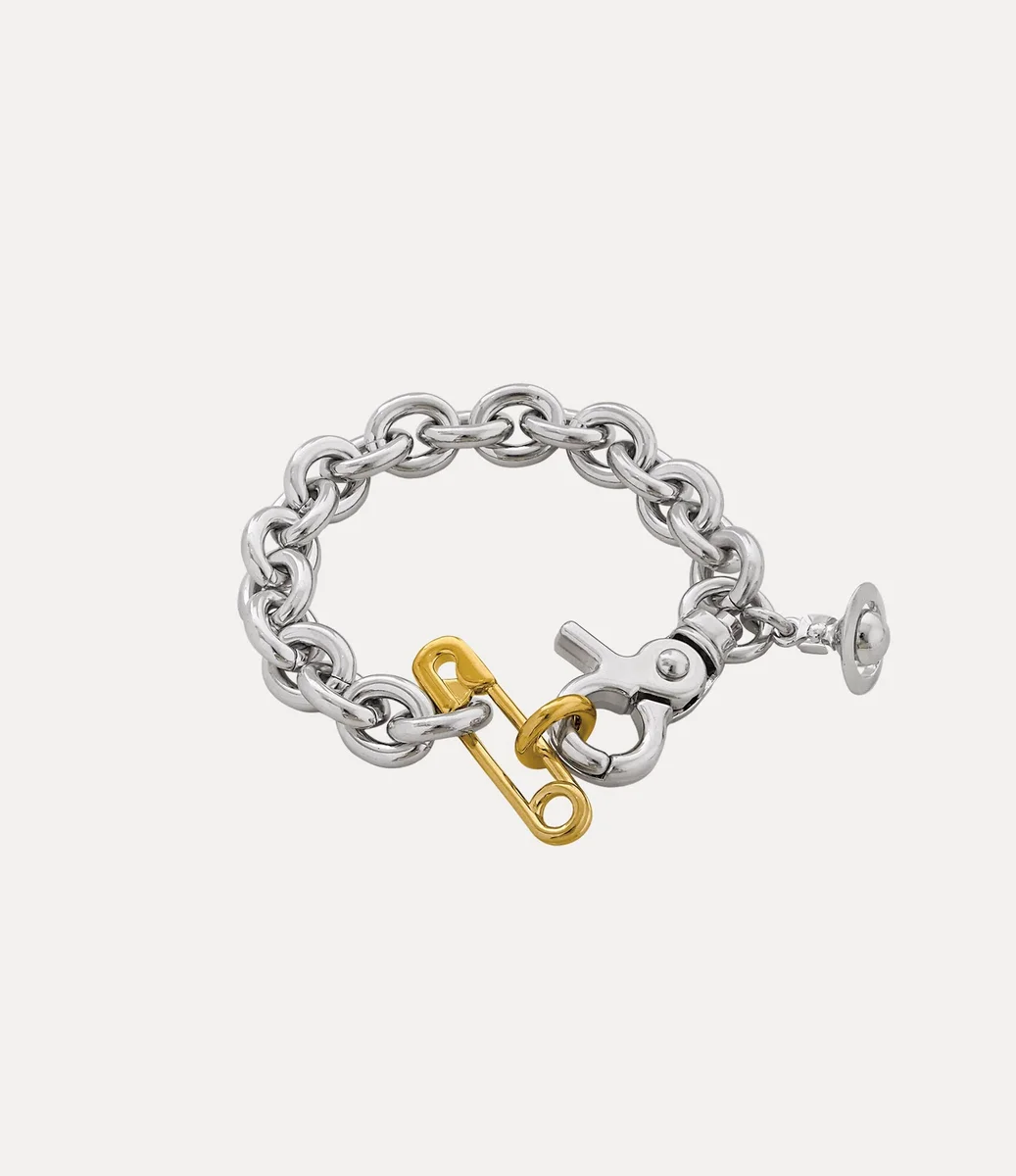 The Man. Claude bracelet, designed with a silver-tone finish, features our signature safety pin detail – a nod to Vivienne’s punk-inspired, non-conformist style. A three-dimensional metal orb charm hangs from the sturdy cable chain, adding a dynamic aspect to the piece, while the hardware-inspired clasp allows for an easy closure.