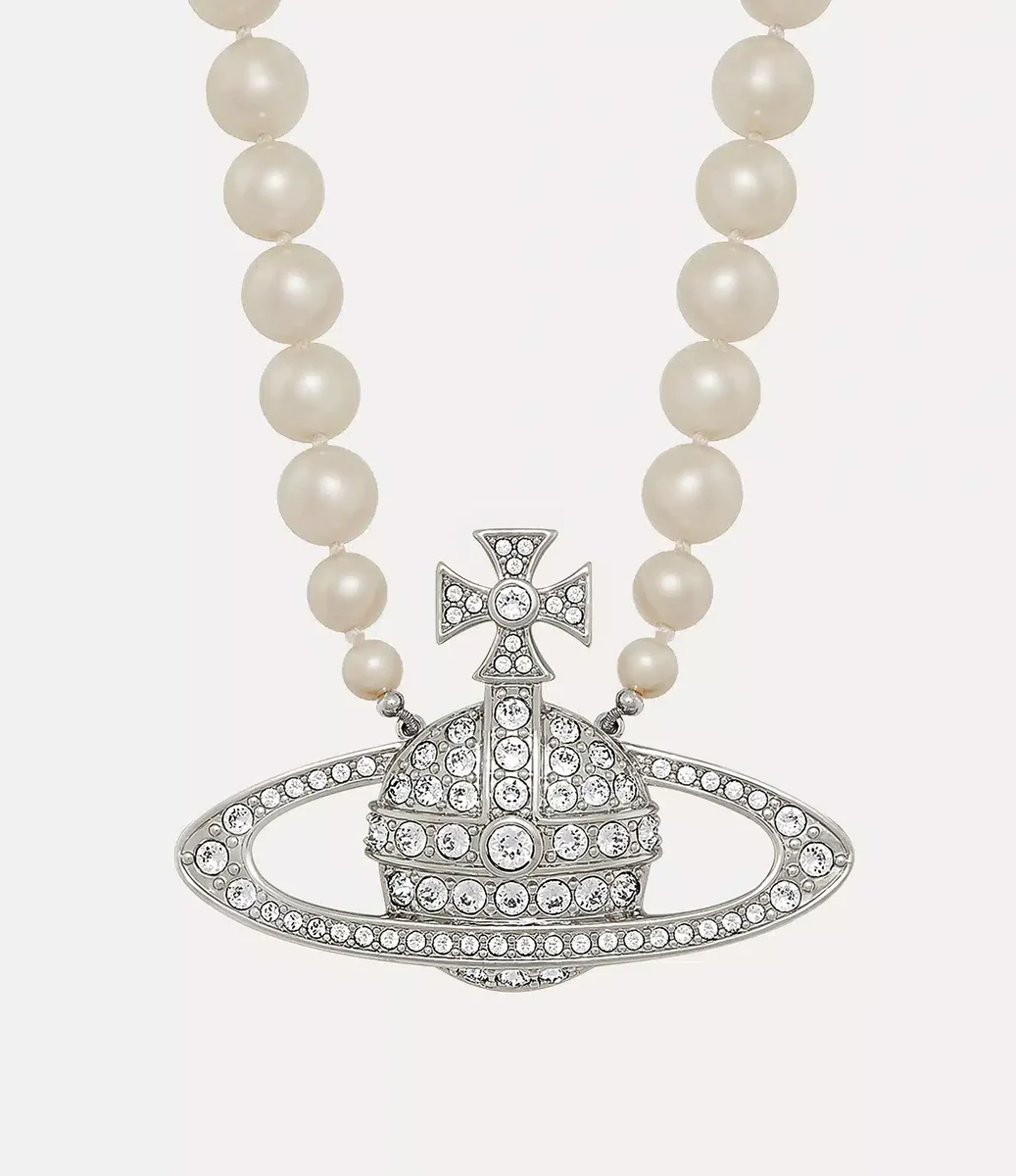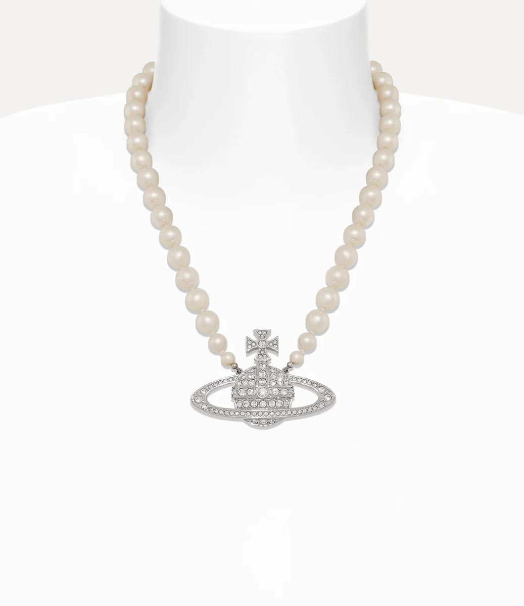 Pearls are essential to the house’s heritage, evoking a sense of bygone luxury. Our Man. Bas Relief Pearl necklace showcases a row of hand-knotted Swarovski pearls, elegantly graduating in size, complete with a crystal-embellished orb motif in the centre of the design – synonymous with Vivienne’s vision of launching tradition into the future.