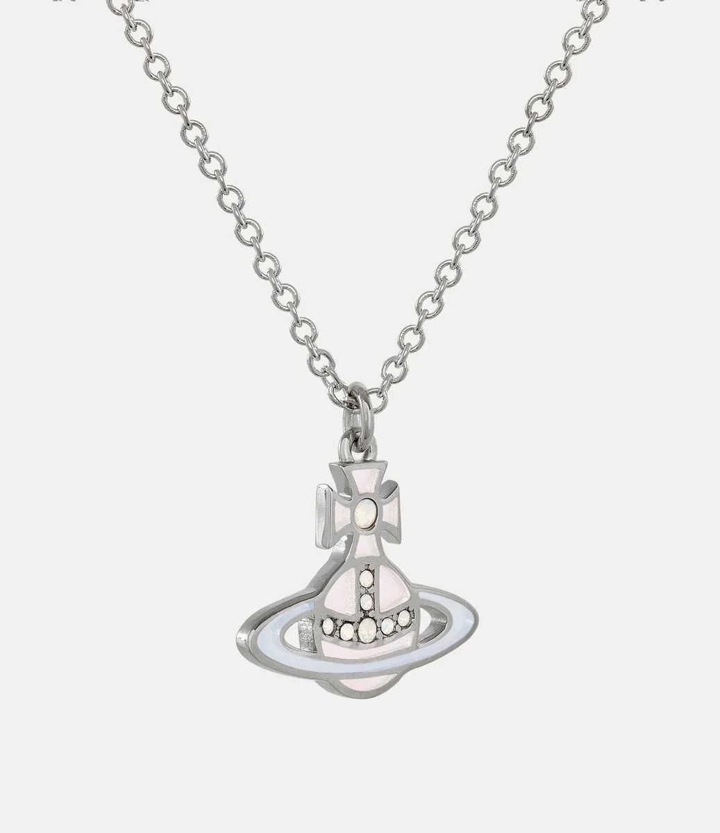 The house’s orb silhouette is synonymous with Vivienne’s vision of launching tradition into the future. This season’s Man. Concetta Pendant necklace adopts the shape of the classic orb, enhanced by a translucent enamel finish, complete with glistening crystal details in the harness and cross top.