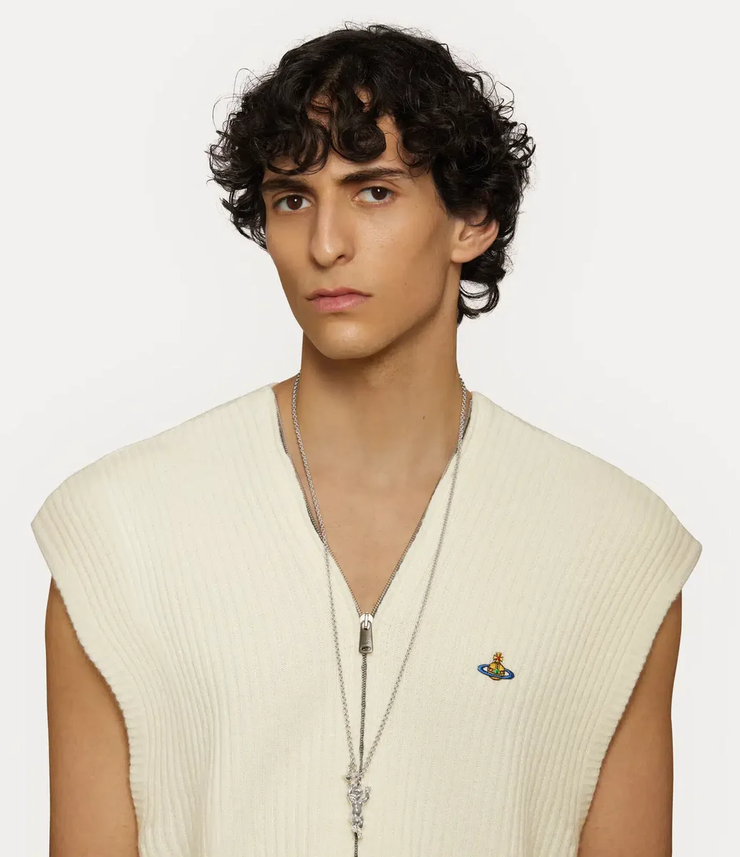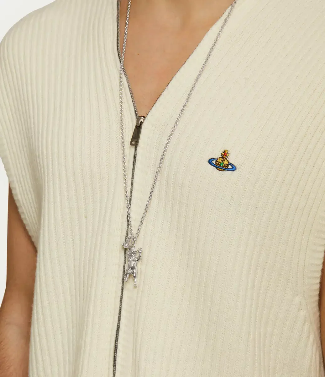 The Man. Satyr Pendant Necklace offers a striking satyr motif at the centre, which pays homage to the heritage designs from Vivienne’s iconic ‘Britain Must Go Pagan’ era (1987–1990). The piece is adorned with silver-tone plating and features our signature dangle orb motif along the refined trace chain, embodying the house’s ethos of launching the past into the future.
