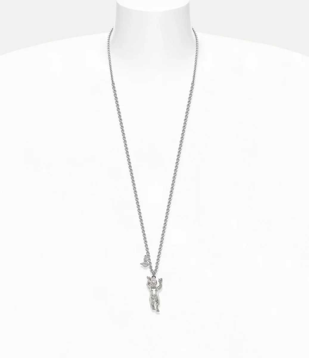 The Man. Satyr Pendant Necklace offers a striking satyr motif at the centre, which pays homage to the heritage designs from Vivienne’s iconic ‘Britain Must Go Pagan’ era (1987–1990). The piece is adorned with silver-tone plating and features our signature dangle orb motif along the refined cable chain, embodying the house’s ethos of launching the past into the future.
