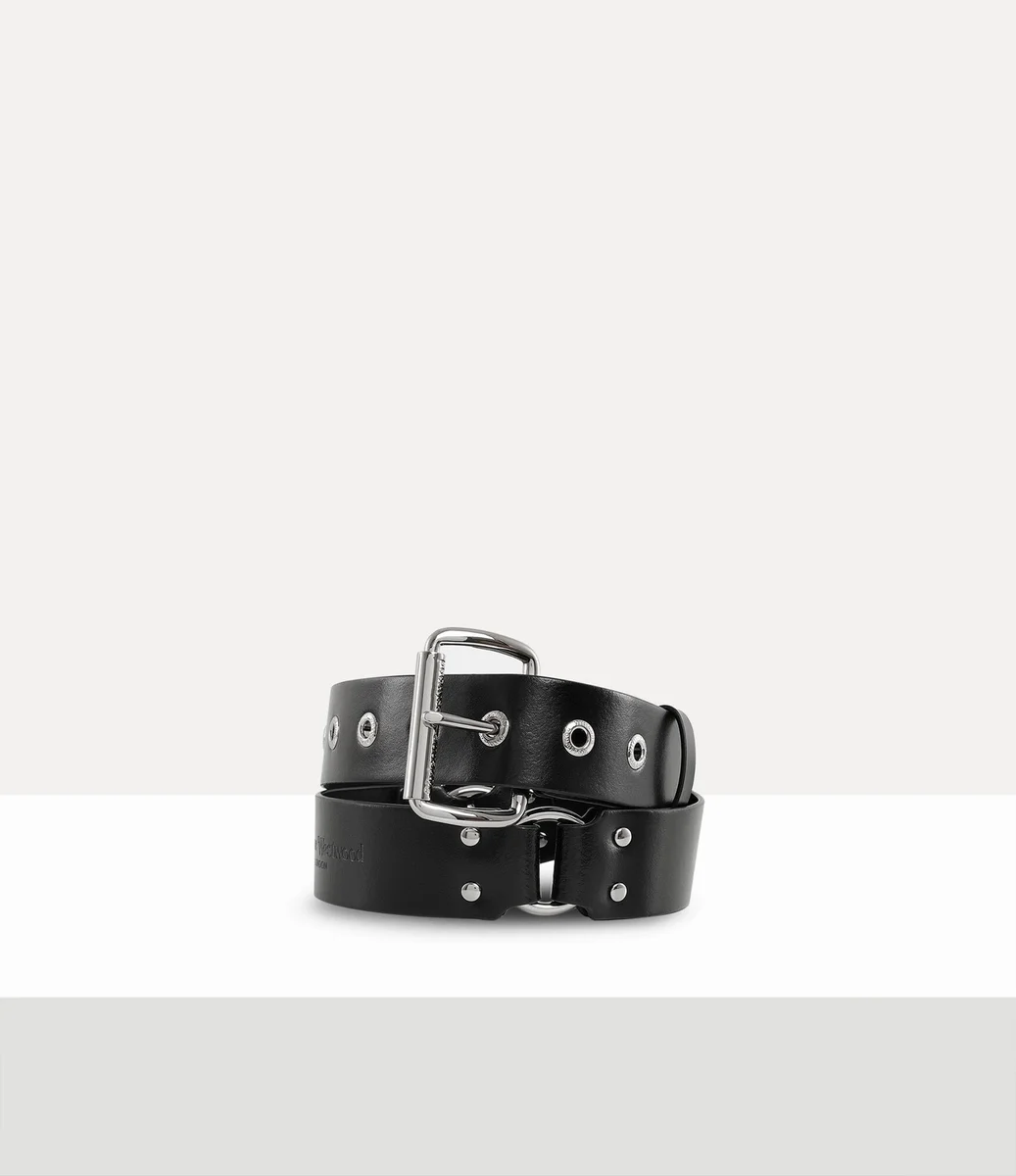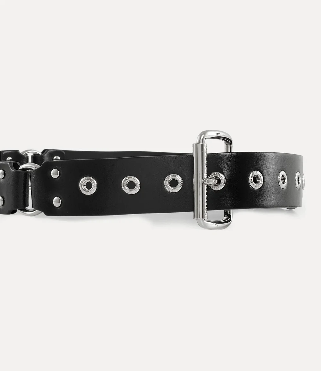 Inspired by the Vivienne Westwood Spring-Summer 1995 ‘Erotic Zones’ collection, this belt is adorned with bold, bondage-inspired hoops and statement metal hardware. A polished roller buckle completes the design, while engraved lettering decorates the eyelet details.