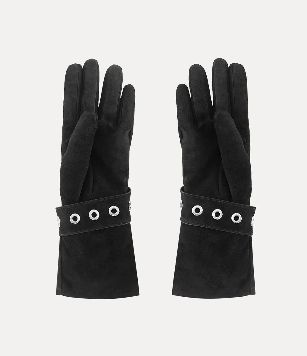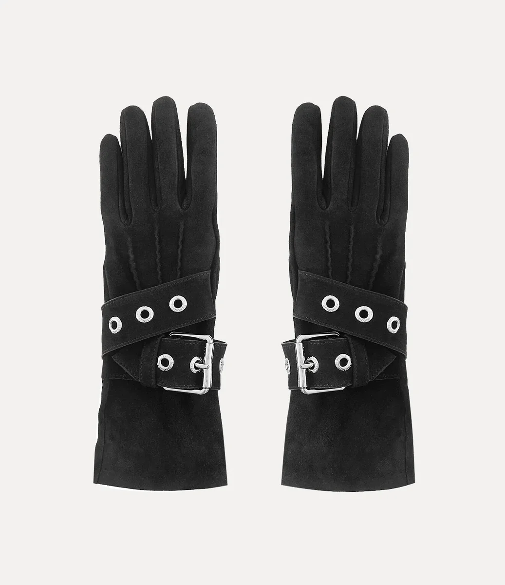 Vivienne Westwood Belt buckle gloves are offered in soft, suede leather, complete with an extended cuff length.