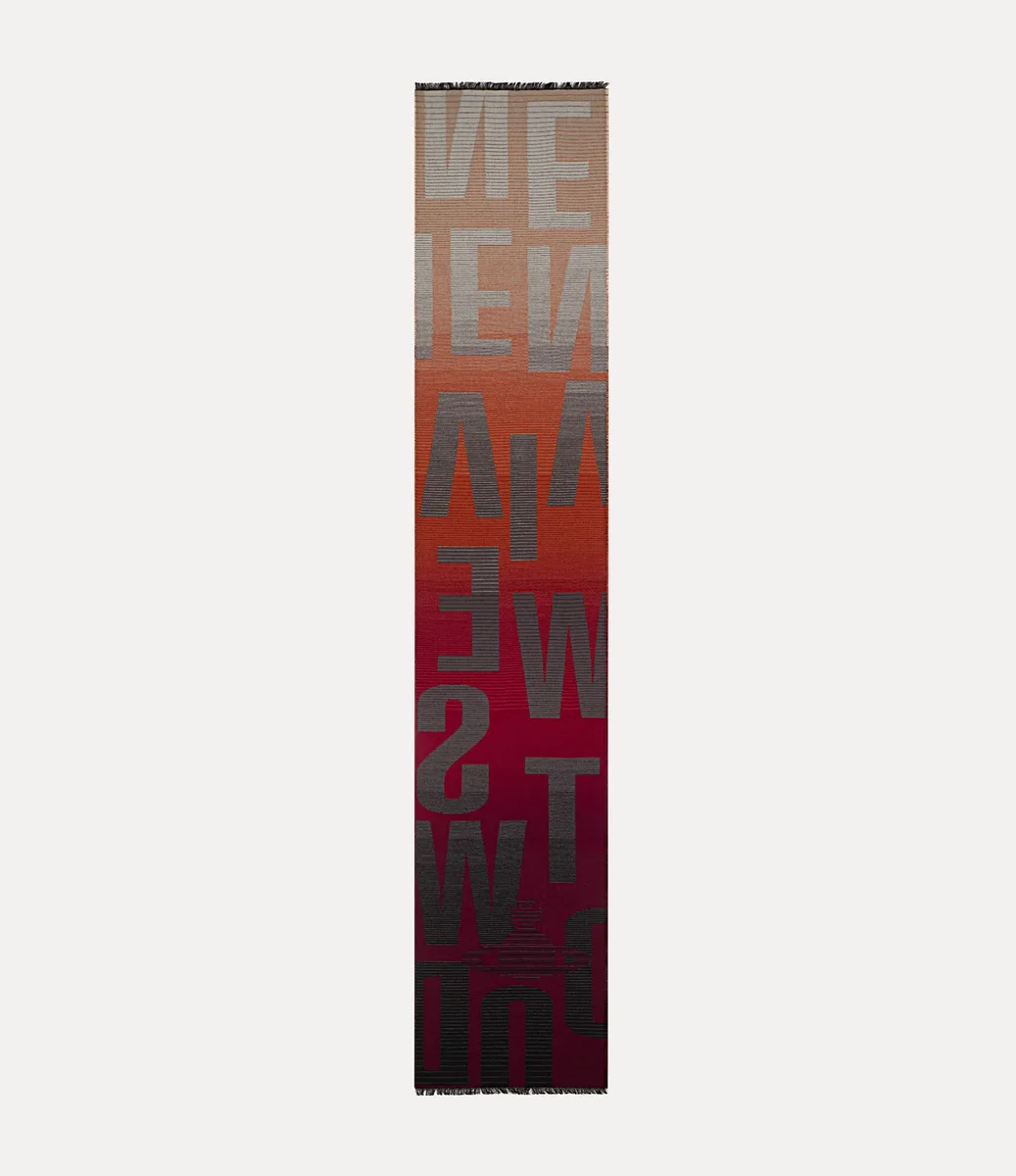 The Vivienne Westwood scarf features this season’s bold ‘Logomania’ jacquard, woven in soft gradient tones.Finished with light fringing along the edges, the piece reflects Vivienne’s vision of propelling the past into the future.