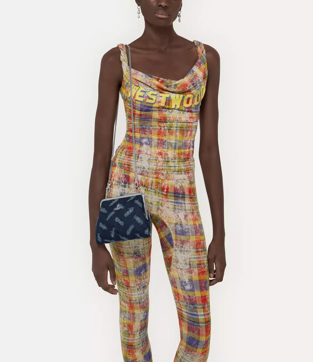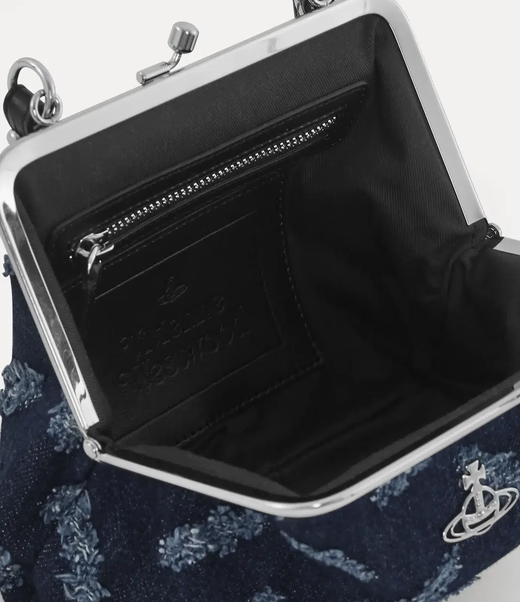 Vivienne Westwood Granny Frame purse in cotton is adorned with this season’s ‘Ripped’ denim motif, complete with a silver-tone orb at the front.