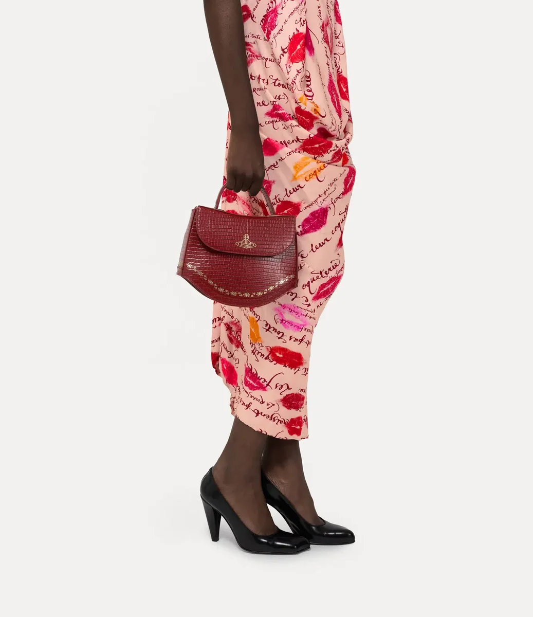 Our Chloe Top Handle bag is crafted from soft calf leather and features this season’s ‘Mini’ croc-effect embossed motif. Gold-tone foil detailing outlines the curved silhouette, drawing inspiration from antique jewellery boxes.