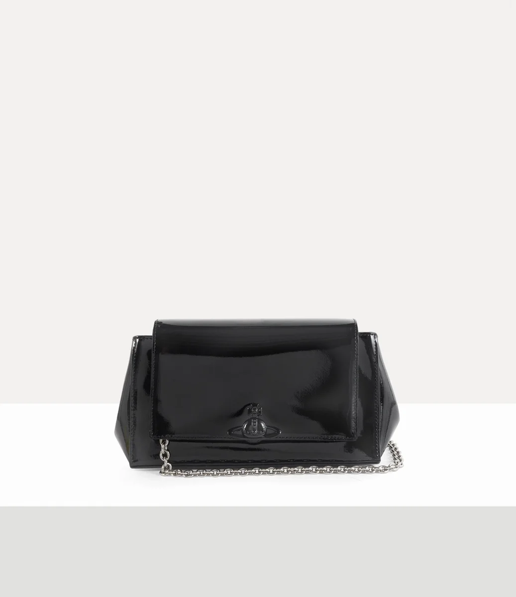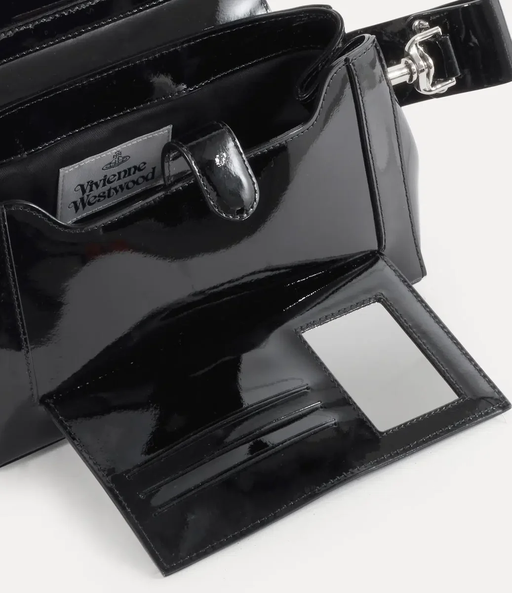 Vivienne Westwood Hazel Medium handbag is crafted from full-grain cow leather with a high-shine patent coating, lined in a soft blended recycled cotton finish.