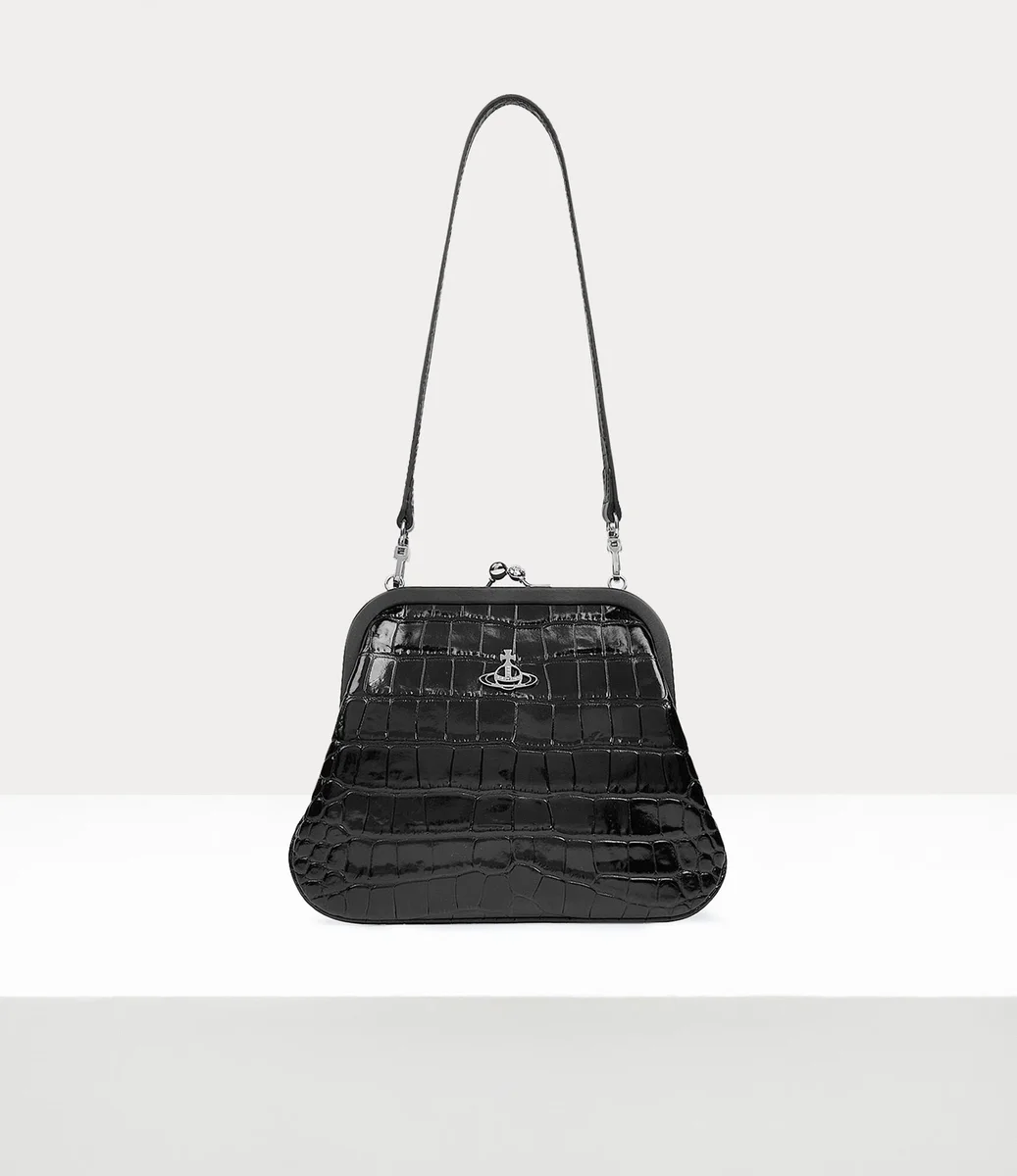 Vivienne Westwood Vivienne’s clutch is offered in a shiny leather finish, featuring a vintage-inspired kiss-lock frame and croc-effect embossing.