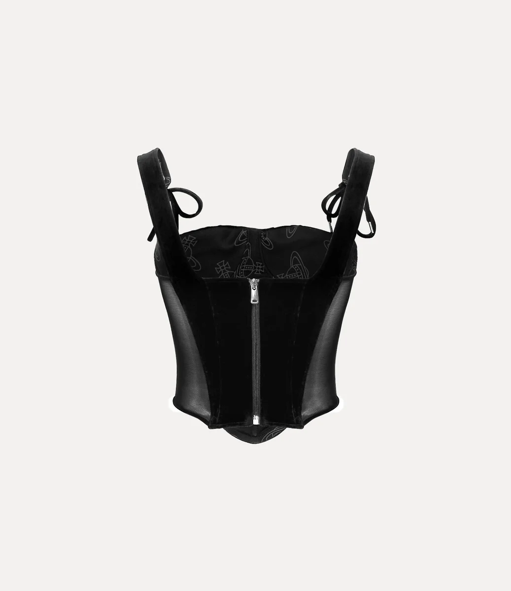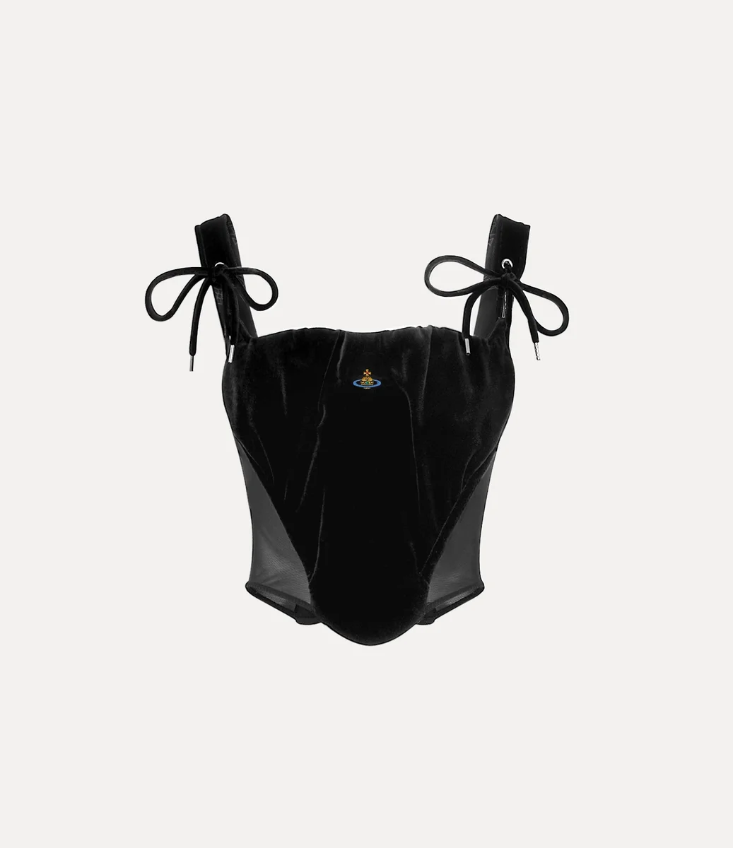 Vivienne Westwood Puppy corset is crafted in a black velvet colourway, defined by its cinched waist and gently curved square neckline.