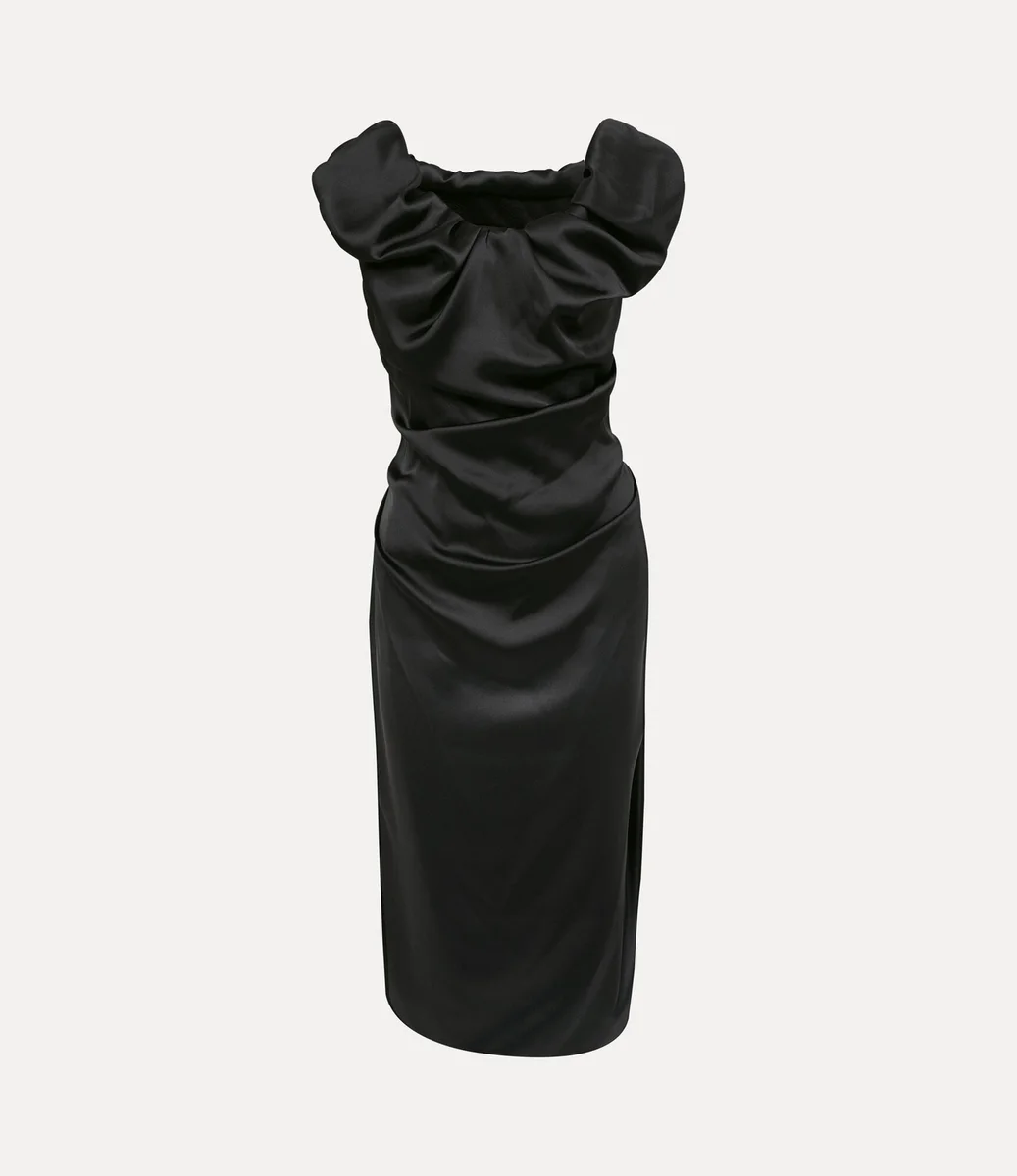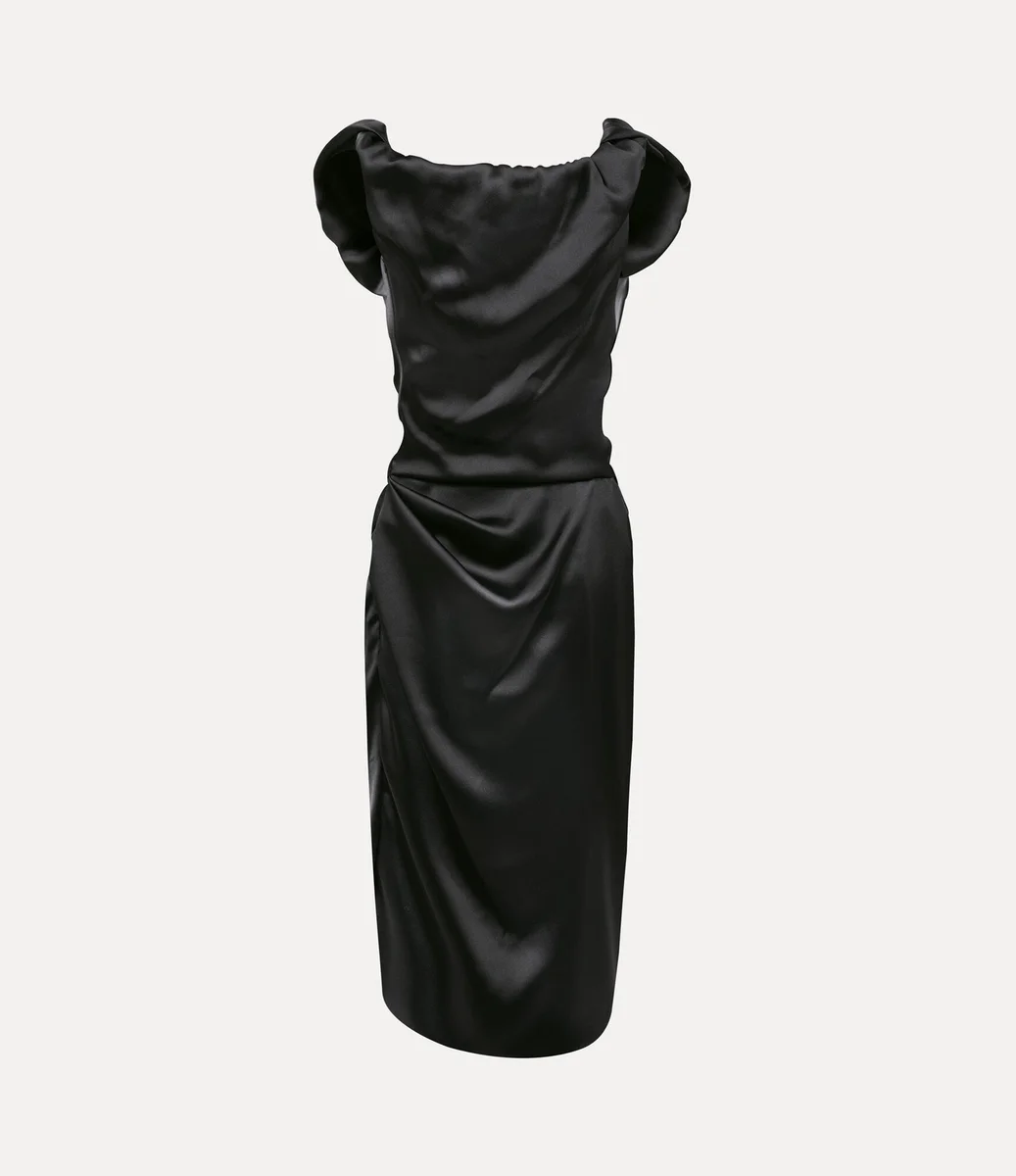 Vivienne Westwood Ginnie Amber dress is reimagined in a luxurious satin finish this season, with a knee-length silhouette.