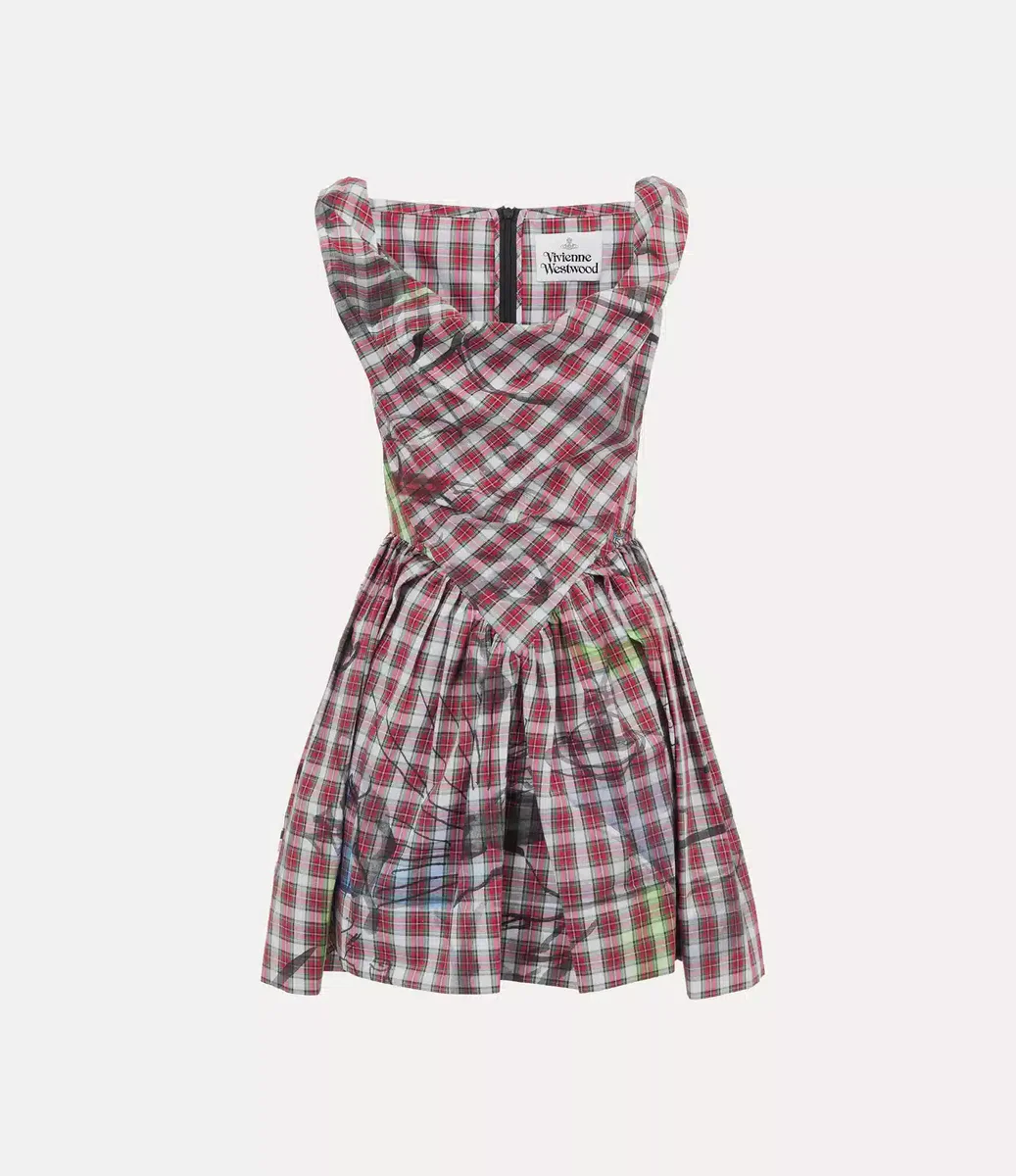 This season, our Mini Sunday dress is cut in a printed red tartan check motif, evoking a classic homespun aesthetic. Overlaid with Dominic Myatt’s hand-drawn printed illustrations and accented with vibrant graffiti sprays, the design pays homage the house’s irreverent ‘DIY’ punk spirit.