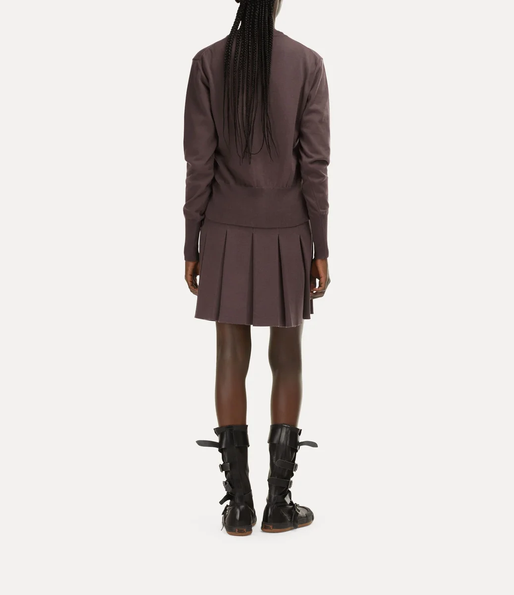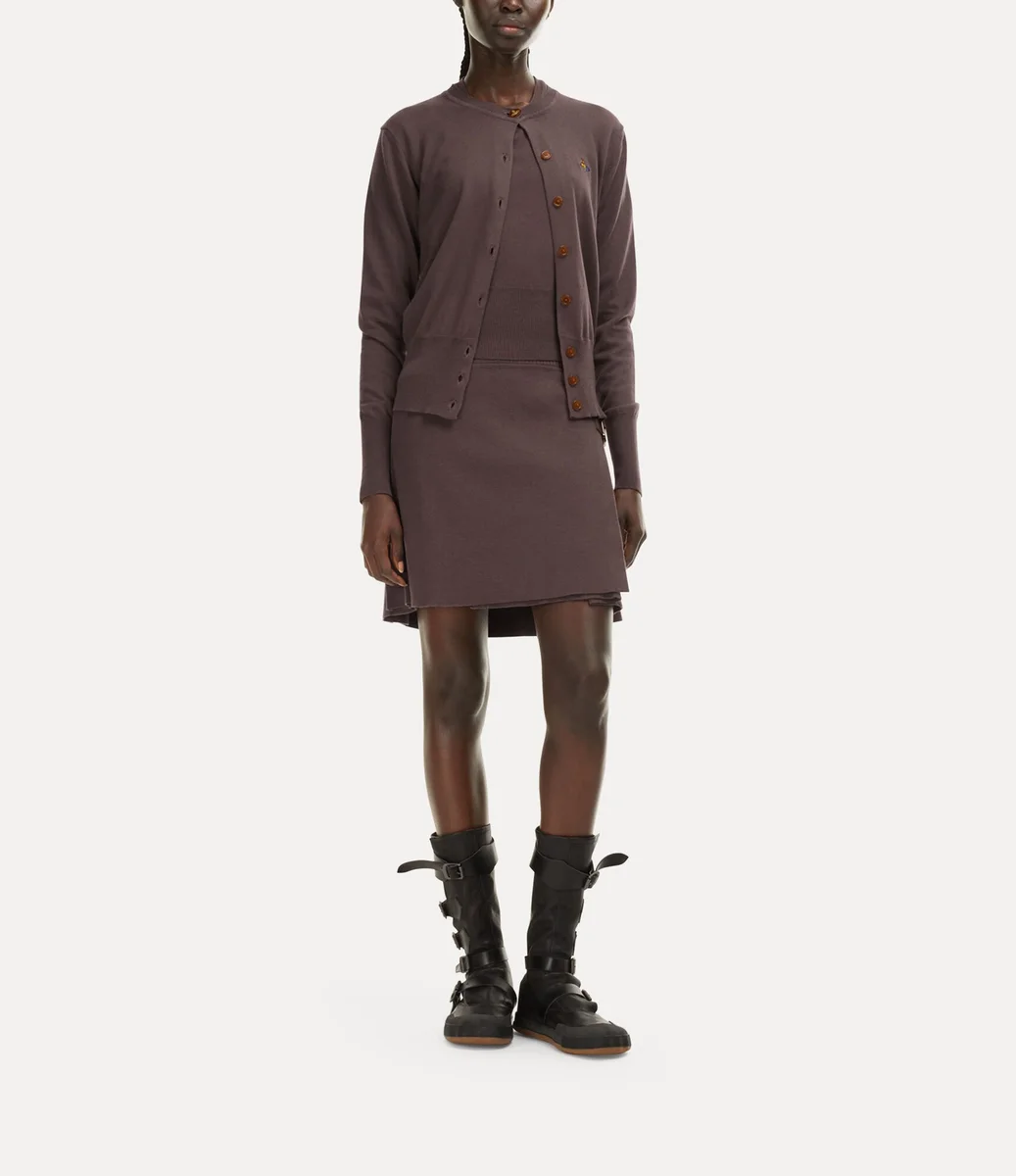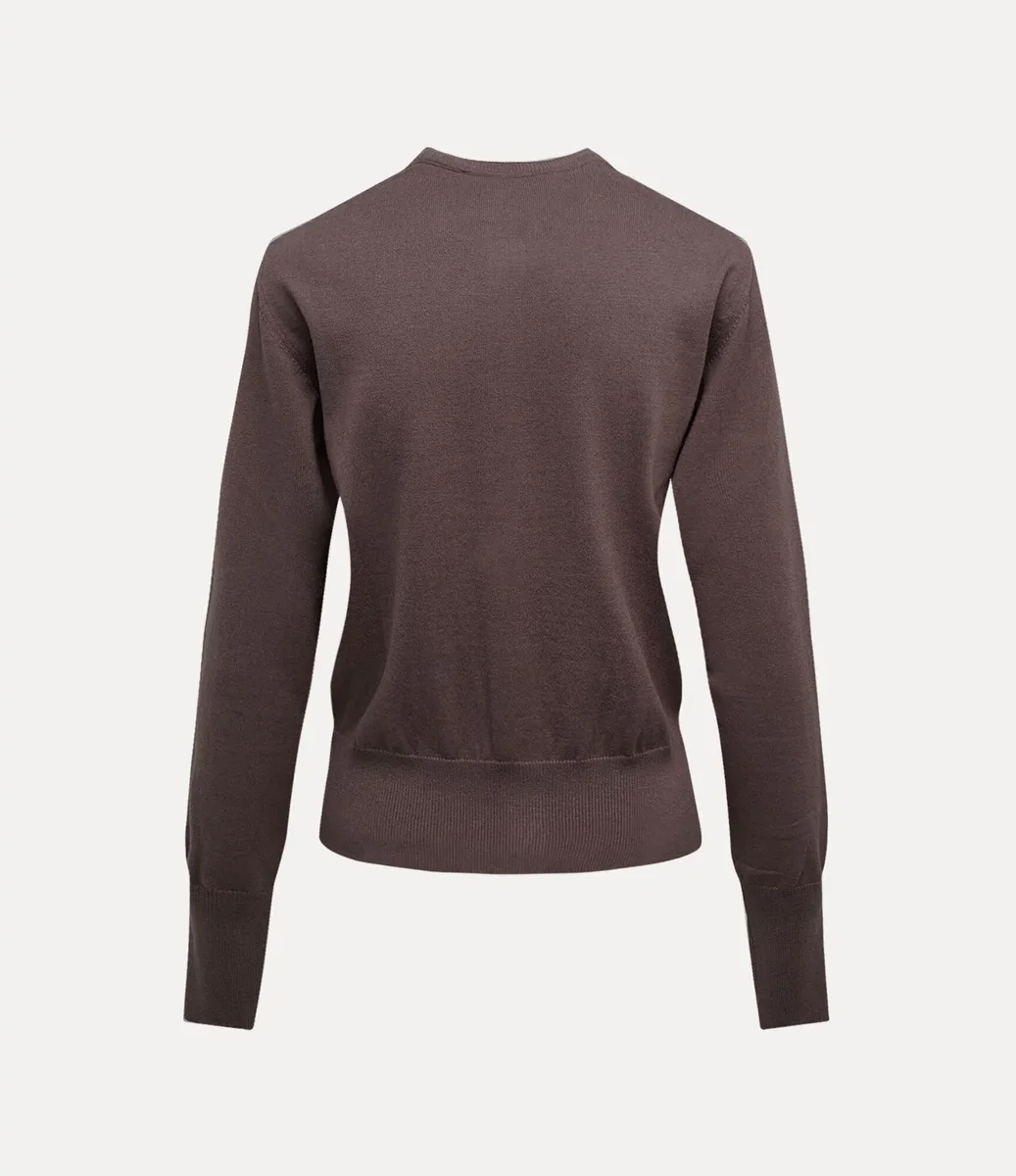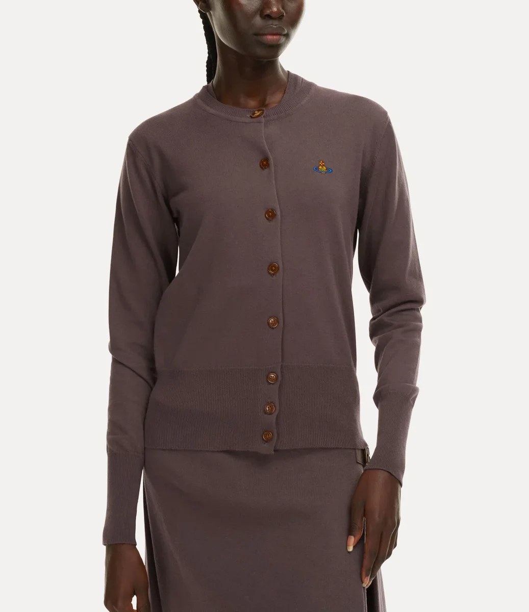 Our Bea cardigan features a cotton-cashmere finish, complete with a round neckline and a fitted silhouette. The piece is adorned with our signature amber-coloured buttons, enhanced by an embroidered orb on the chest, synonymous with Vivienne’s vision of launching tradition into the future.