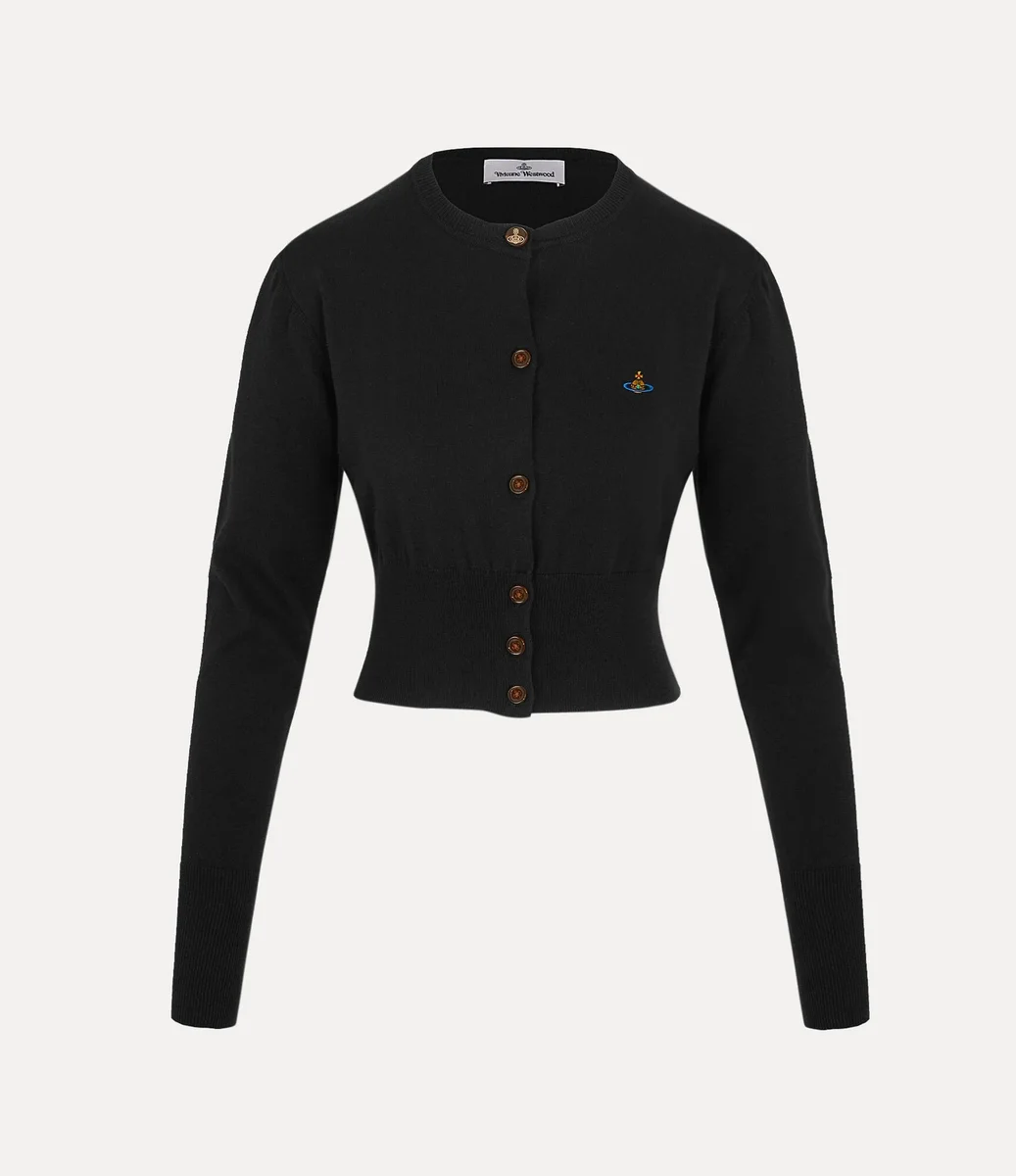Vivienne Westwood Bea Cropped cardigan in a soft cotton-cashmere blend, adorned with a multi-coloured orb embroidery on the left-hand side of the chest.