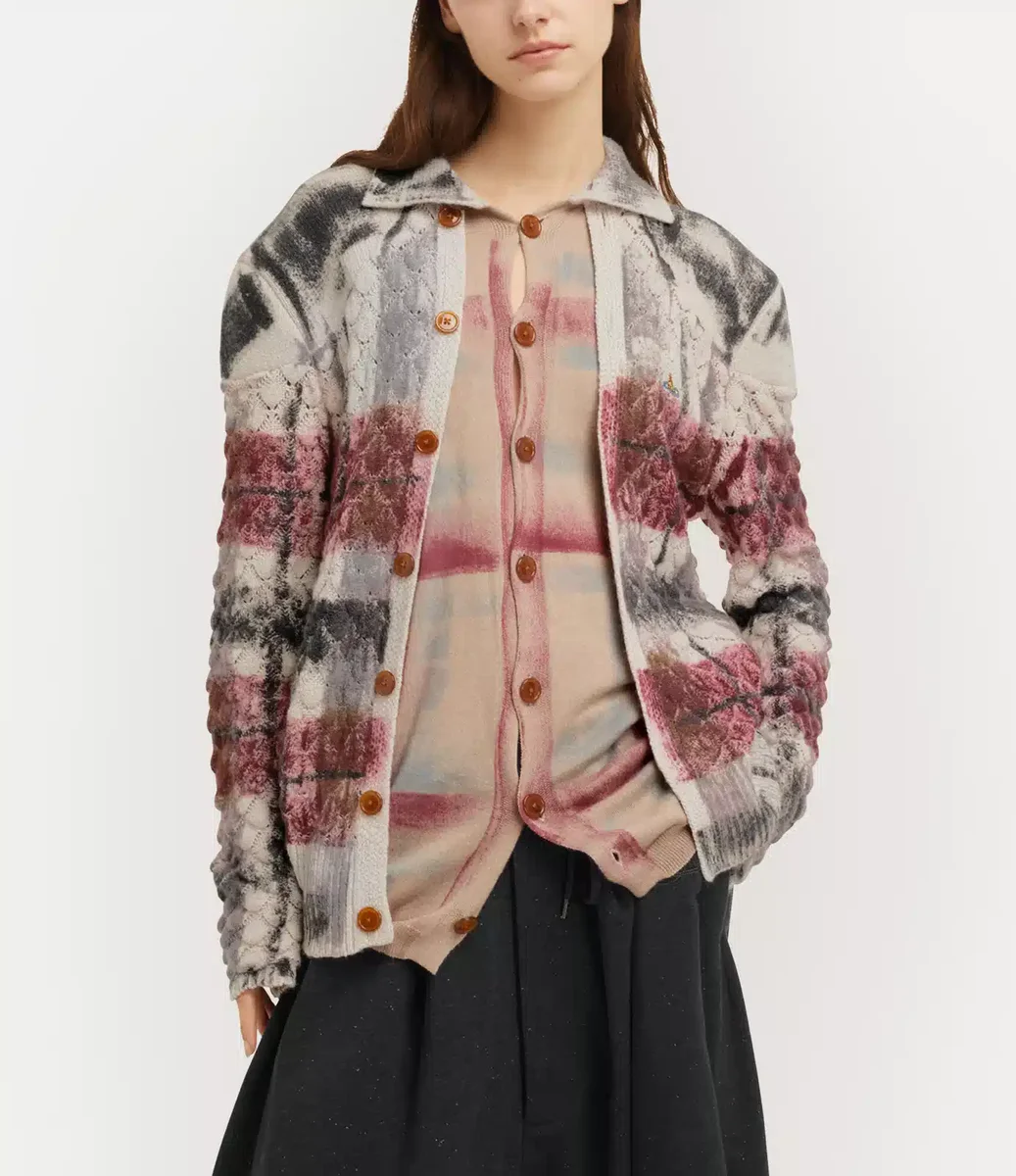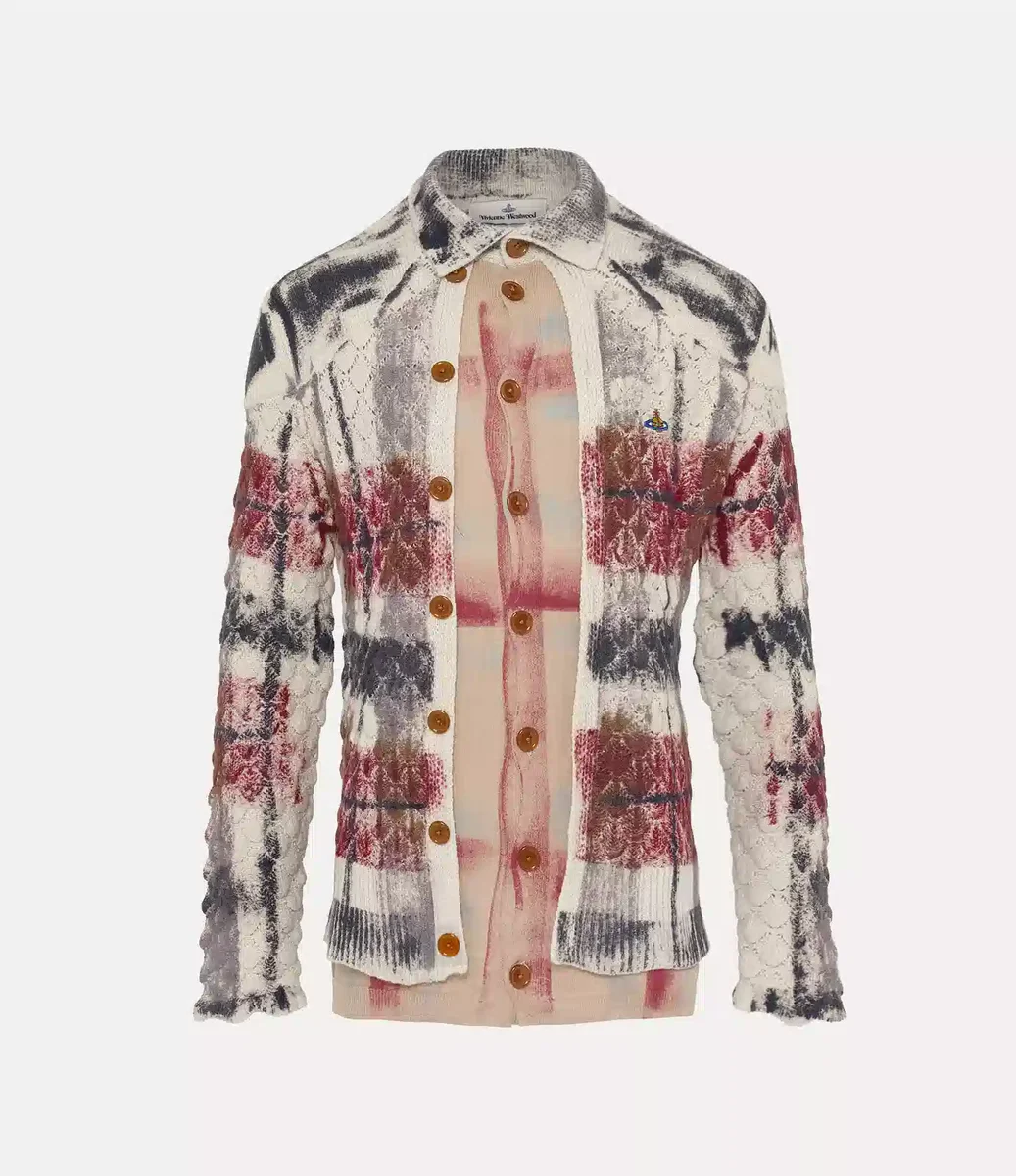 The Dual Tartan cardigan is crafted from a wool-cotton blend,composed of two unique layers.The outer layer is knitted in a delicate diamond-leaf stitch, while the inner features a flat stitch – both finished with hand-applied tartan prints and a distressed finish.