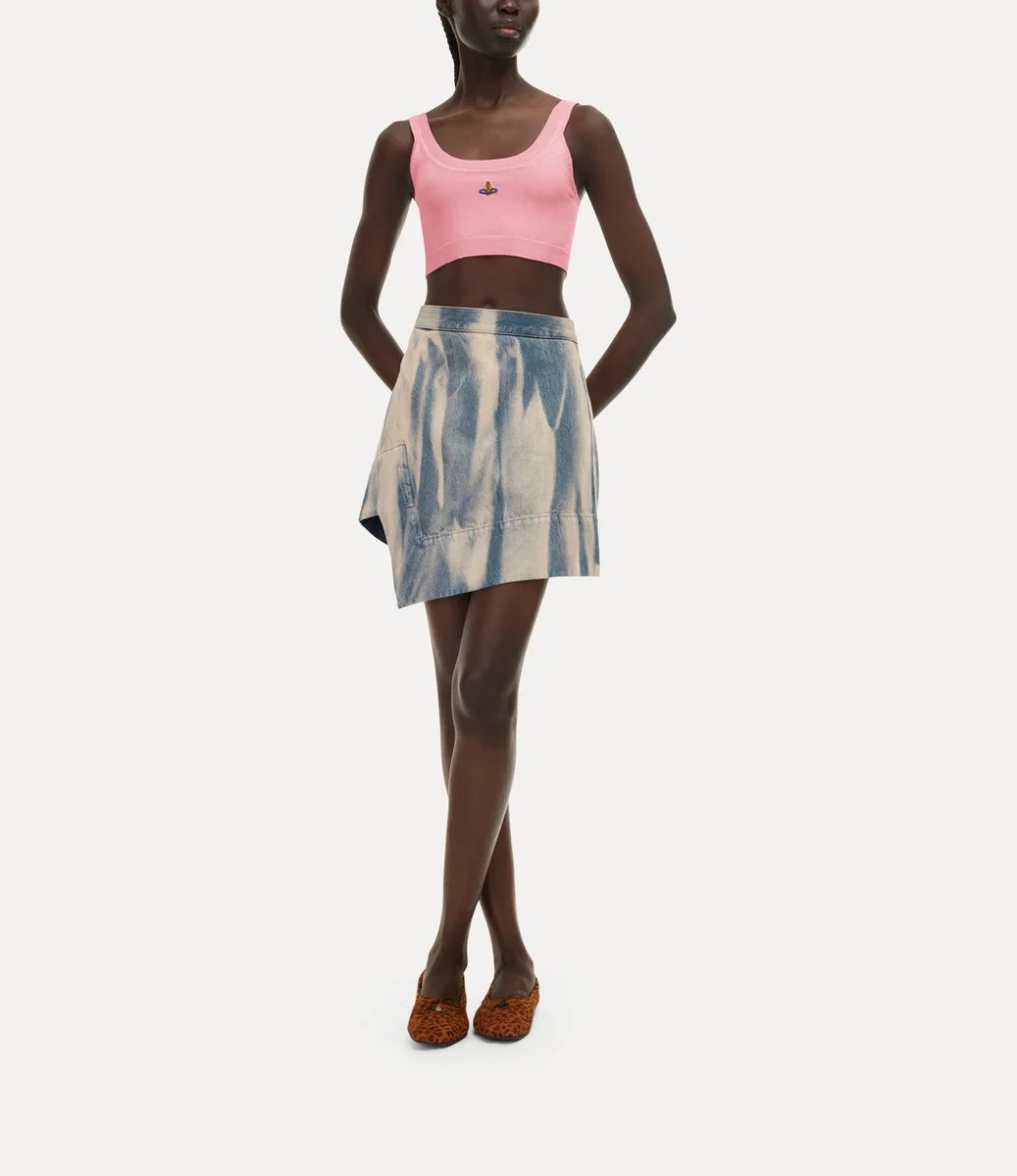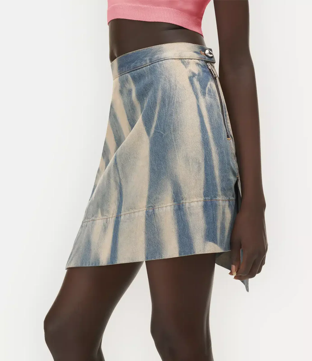 Our Mini Infinity skirt features a soft cotton profile, adorned with a faded, bleached wash for a distressed, vintage-inspired look. The piece offers a wrap-style front that fastens with a concealed button, complete with a mid-rise waistband that falls into an asymmetric A-line shape.