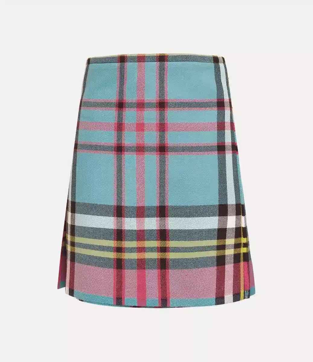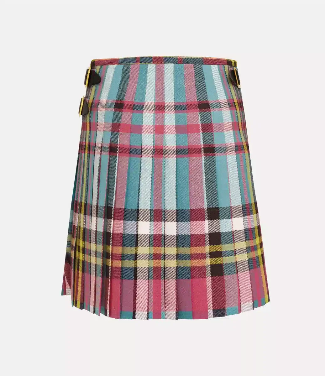 Our Worlds End Medium kilt is an archival signature piece, featuring this season’s enlarged version of the iconic ‘MacAndreas’ tartan, first introduced in the Vivienne Westwood Autumn-Winter 1993 ‘Anglomania’ collection. Crafted from woolen fabric sourced from Lochcarron of Scotland, the kilt sits high on the waist and falls into a pleated finish. Designed to wrap around the waist, it can be adjusted for a personalised fit using the buckle tabs on either side.