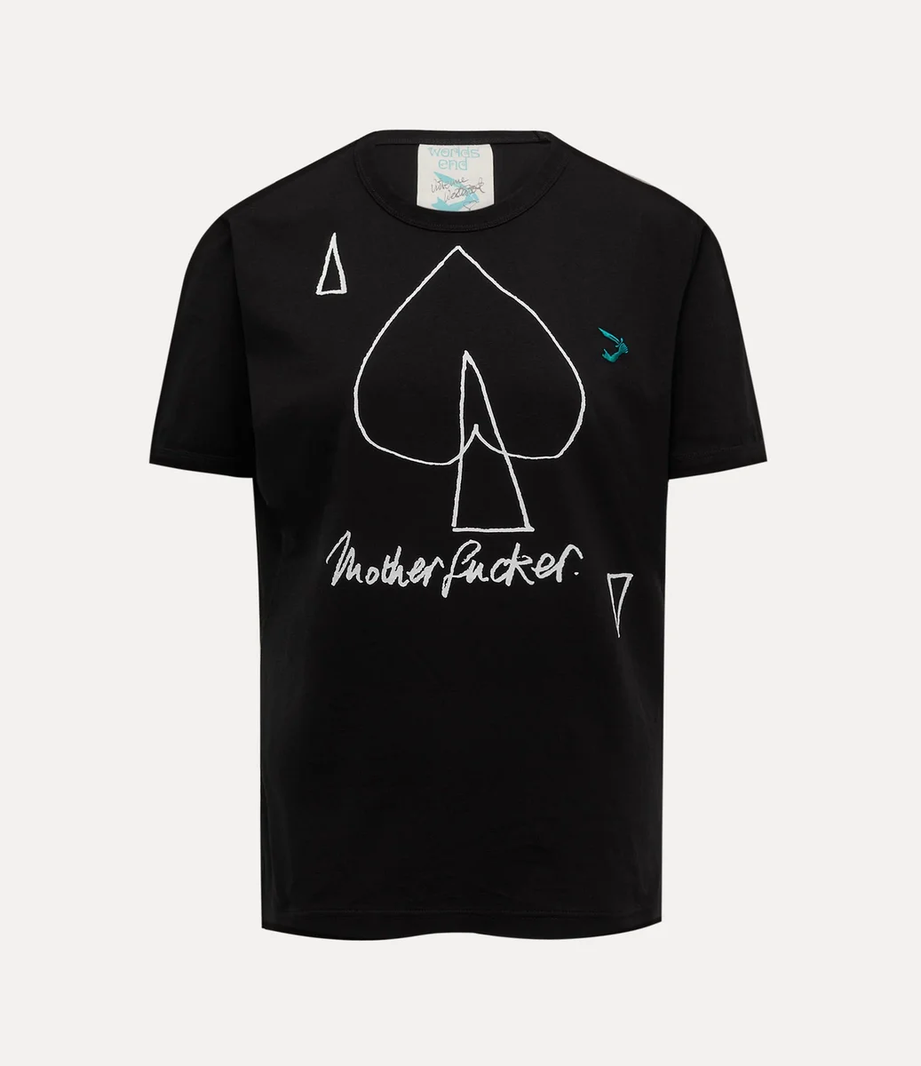 Our Worlds End Classic t-shirt is crafted from soft cotton, featuring short sleeves and a round neckline. The piece is adorned with the archive ‘Arm and Cutlass’ embroidery on the chest and the house’s ‘Motherfucker’ artwork, first introduced in the Vivienne Westwood Spring-Summer 2018 ‘We Are Motherfucker’ show, highlighting the urgent need to protect our planet, Mother Earth.