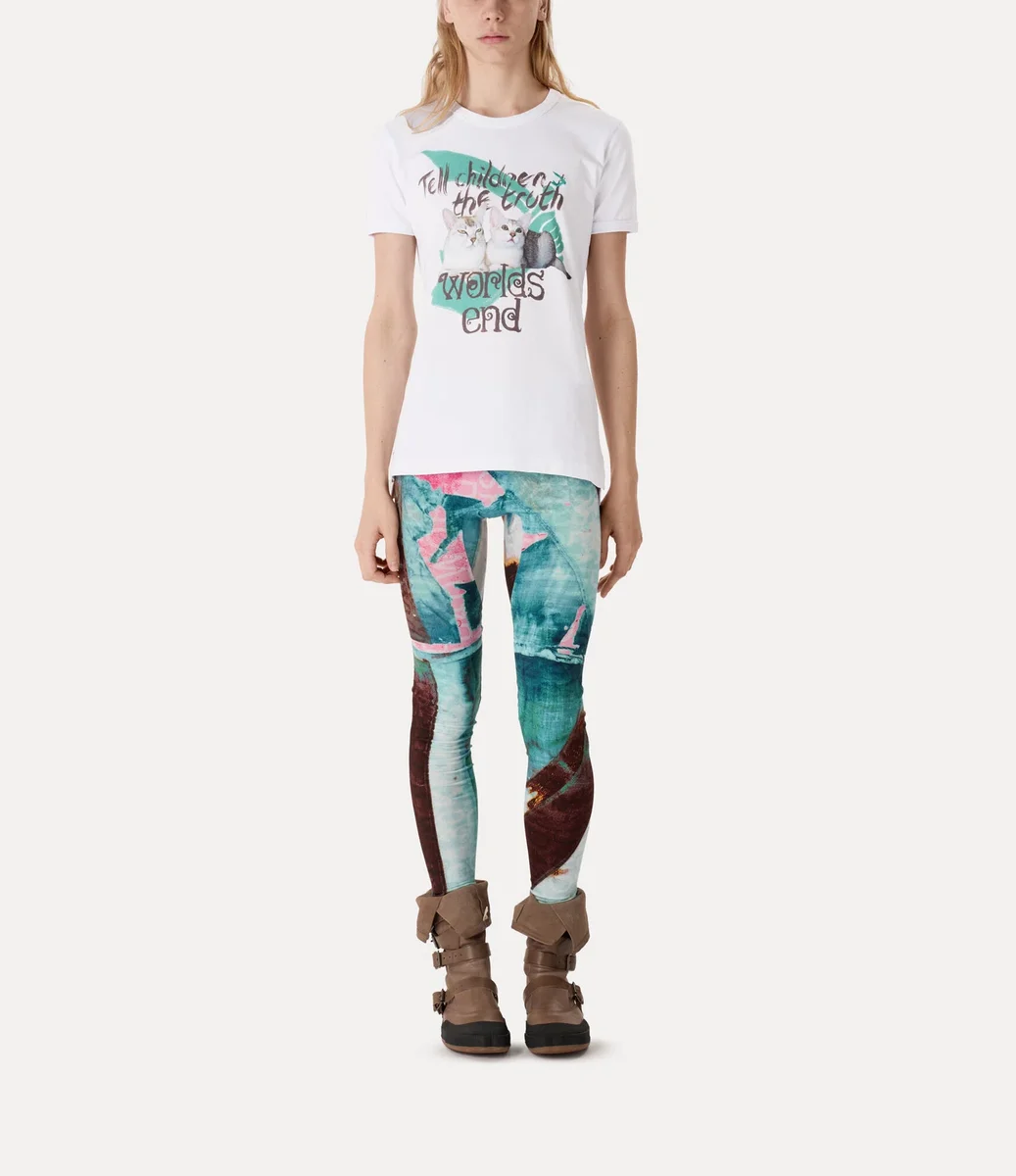 Our Worlds End Classic t-shirt is crafted from soft cotton and features short sleeves with a classic round neckline. The front showcases archival ‘Cats’ artwork alongside the slogan “Tell the children the truth” – addressing societal indifference to environmental crises and the arms trade’s link to the climate crisis.