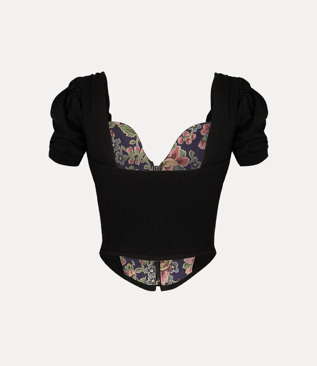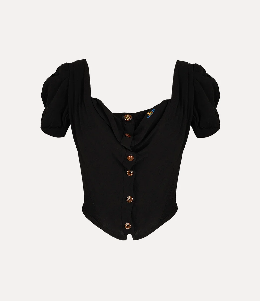 The Short Sleeve Bea Corset cardigan features delicate drapery at the neckline and shoulders, falling into a structured boned bodice, fastening with our classic amber-coloured buttons. The design is adorned with a multi-coloured embroidered orb on the chest, which embodies Vivienne’s vision of launching tradition into the future.
