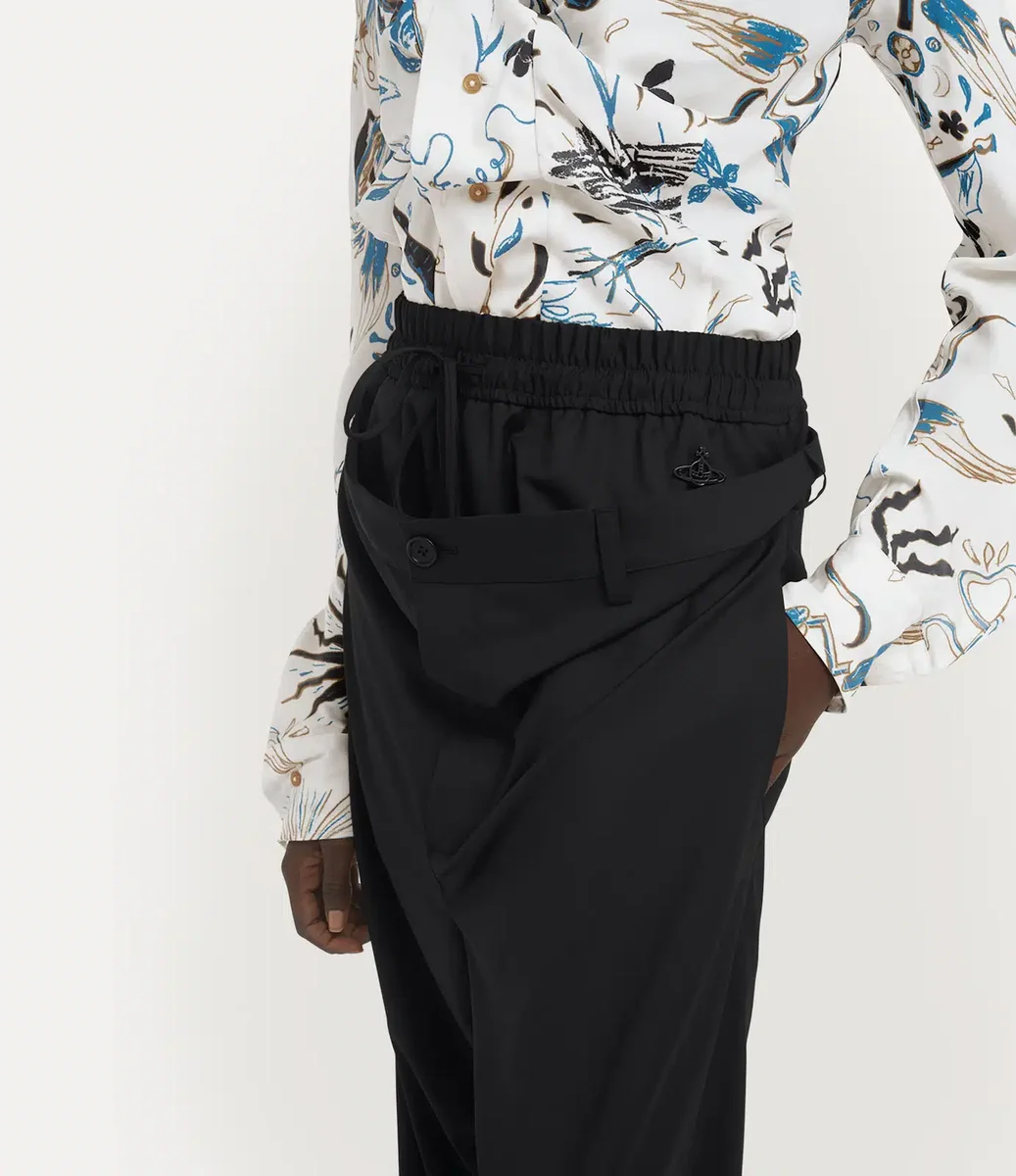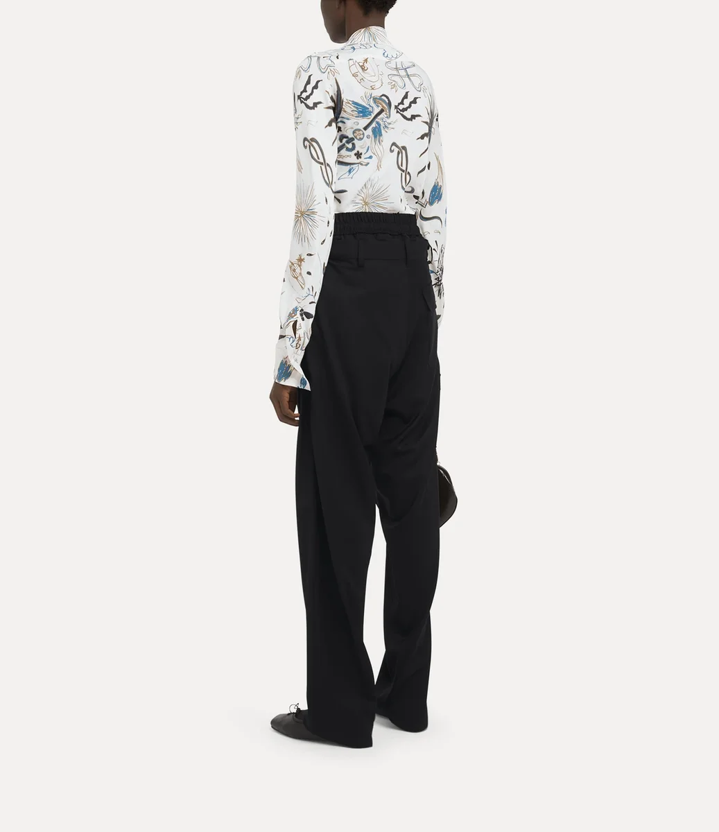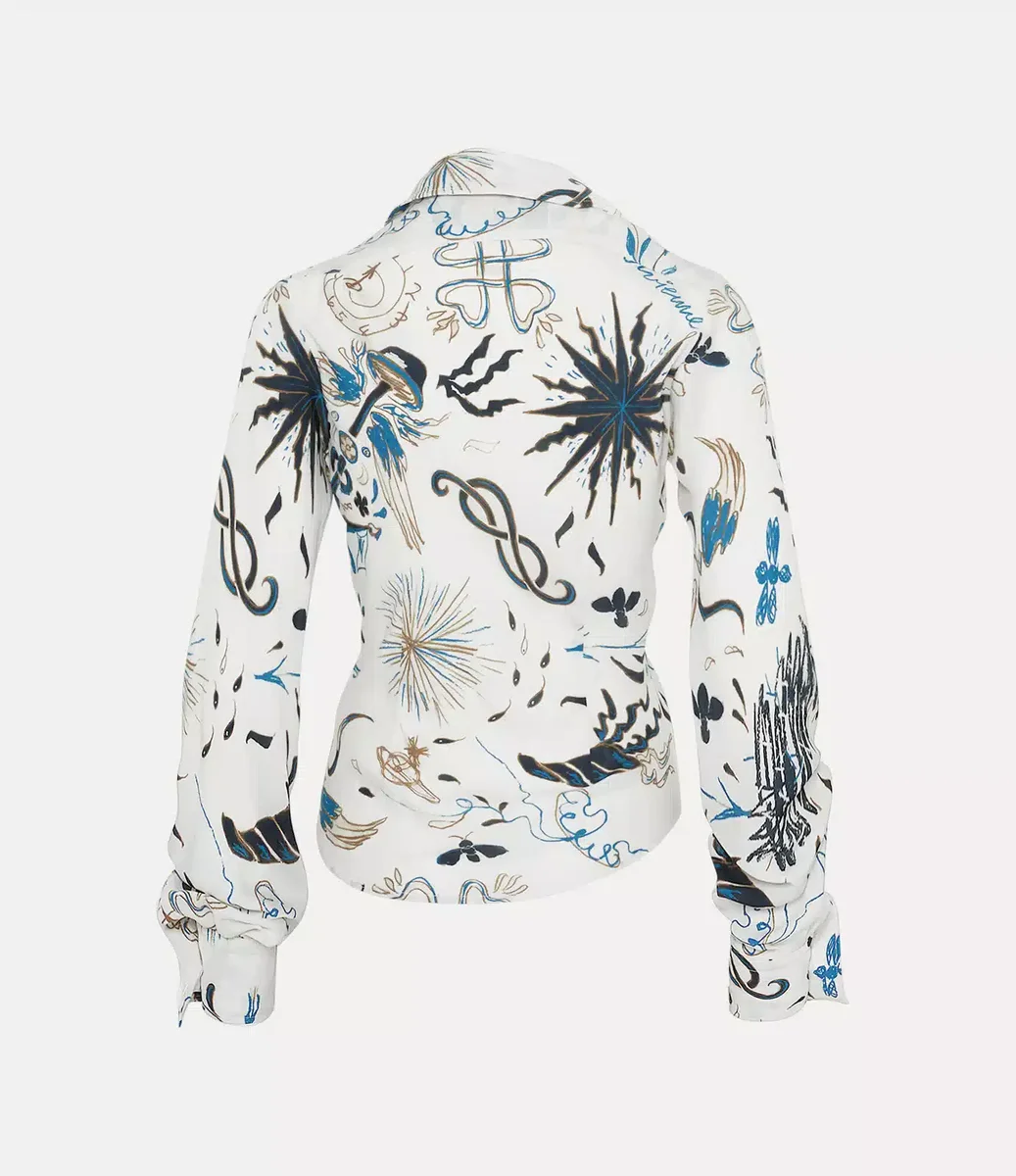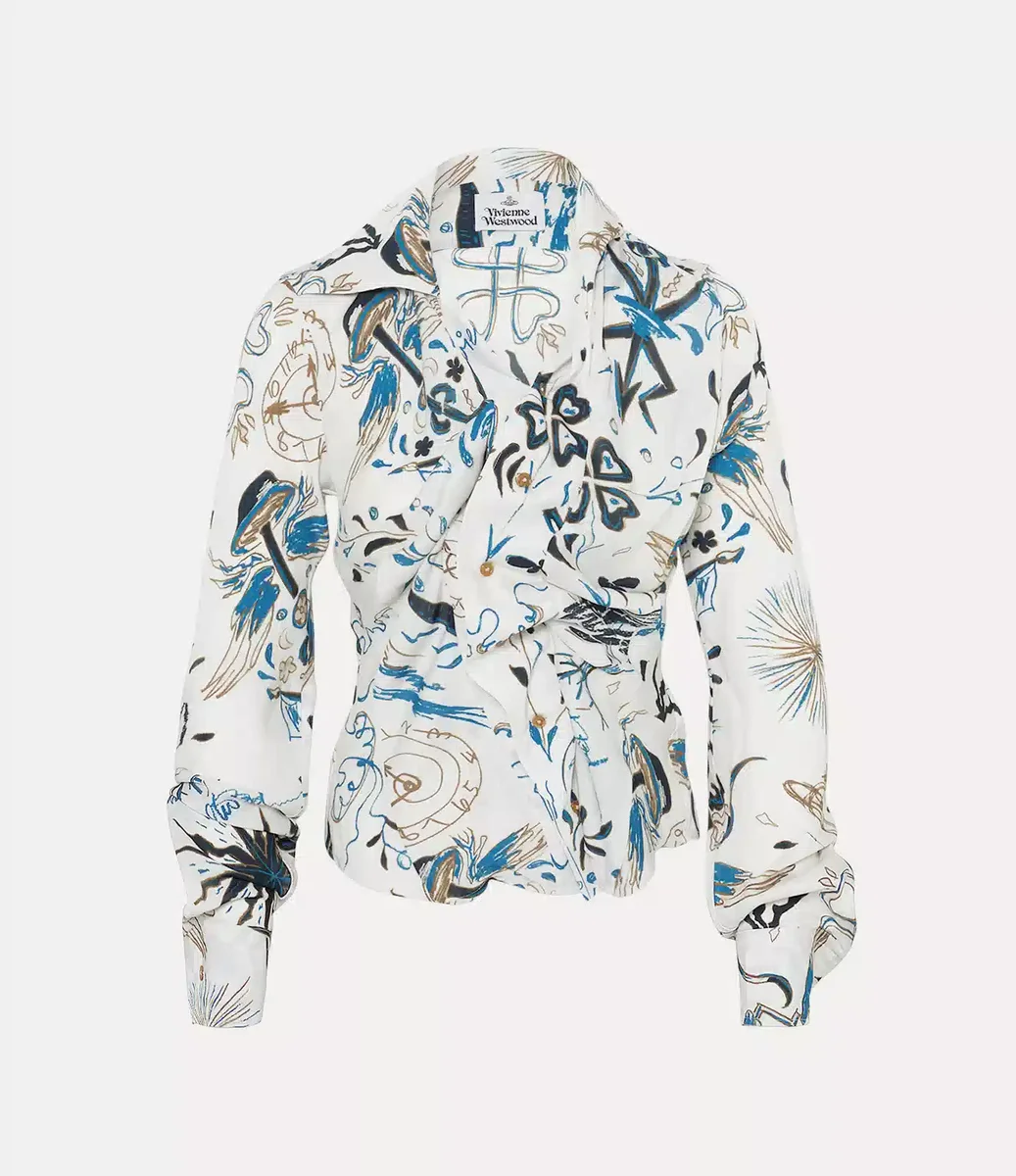 Designed with Vivienne’s experimental drunken tailoring system, our Drunken shirt is cut with an off-centre button placket and an asymmetric hem. Inspired by ‘The Laughing Cavalier’ by Frans Hals, the piece is printed with an abstract graphic design incorporating the house’s signature iconography.
