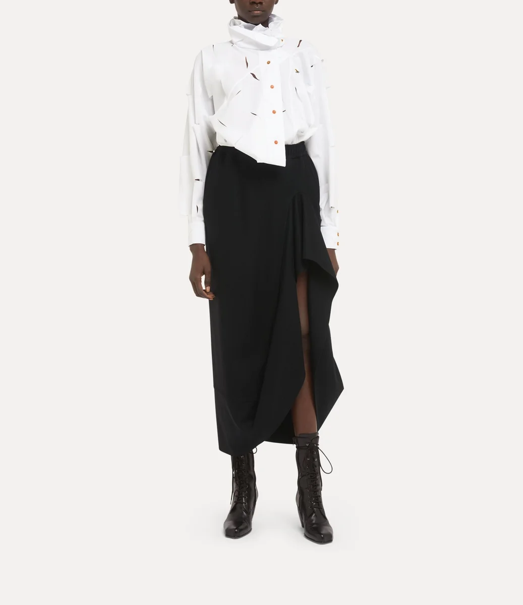 Inspired by Tudor portraiture, our Halston blouse offers a high-stand ruffled collar, secured with a double-button fastening. Soft, sculptural draping falls elegantly across the body, while intricate slash detailing adorns the design – a signature element first introduced in the Vivienne Westwood Spring–Summer 1991 collection, ‘Cut, Slash and Pull’.