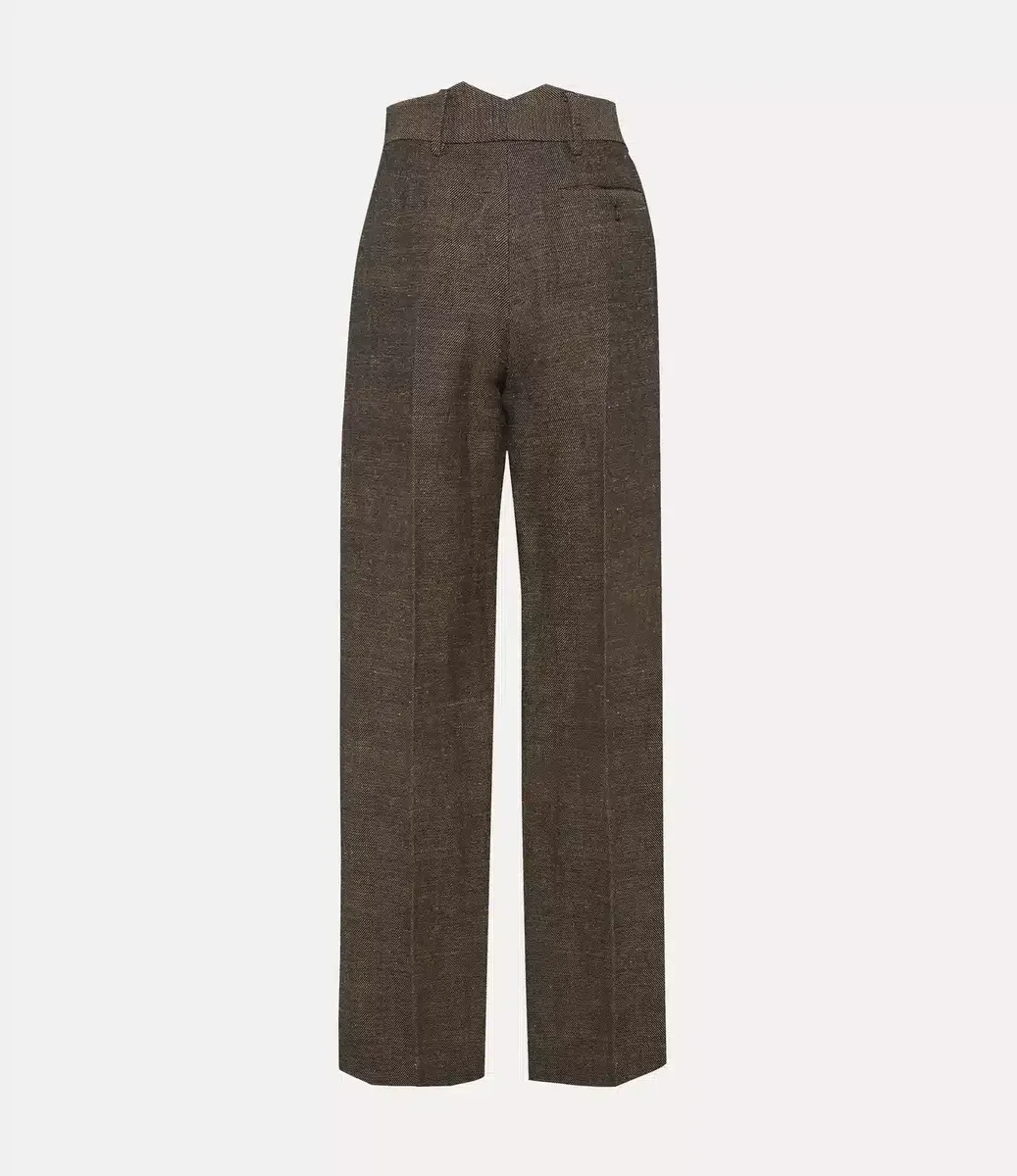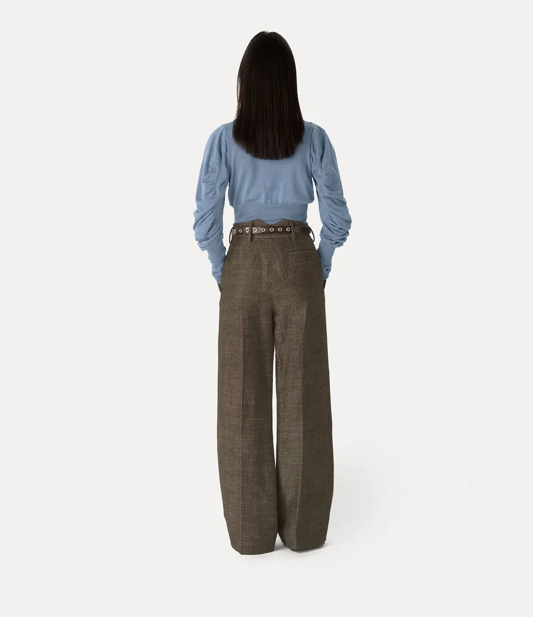 Vivienne Westwood Lauren trousers, crafted from rich linen-wool blend feature a wide-leg silhouette defined by sharp pressed pleats that fall to a straight hemline.