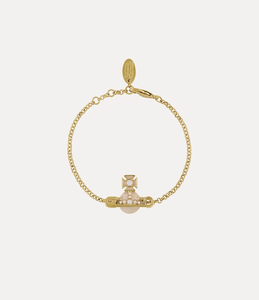 Our Kitty bracelet is reimagined this season in polished gold-tone plating, offered with classic hardware details. The central orb motif is accented with hand-painted translucent enamel and pierced with a classic safety pin motif, a nod to Vivienne’s signature punk aesthetic.