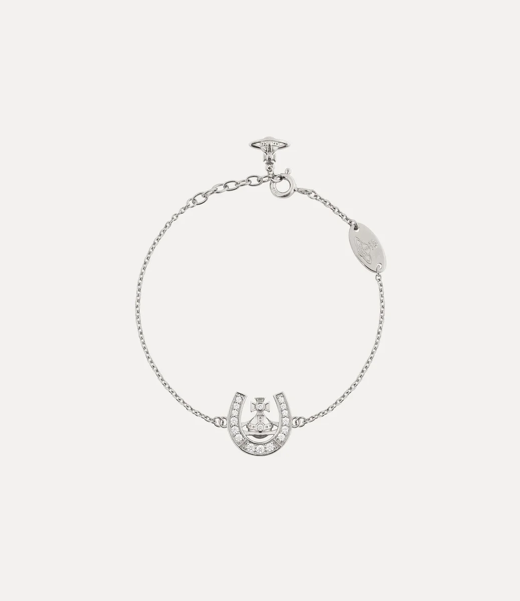 Our Mare bracelet revives the house’s signature iconography, adorned with symbols of good fortune and protection. Encrusted with glistening tonal crystals, the piece features a central horseshoe motif with a platinum-plated orb at its centre, finished with a delicate dangling orb at the lobster-clasp closure.