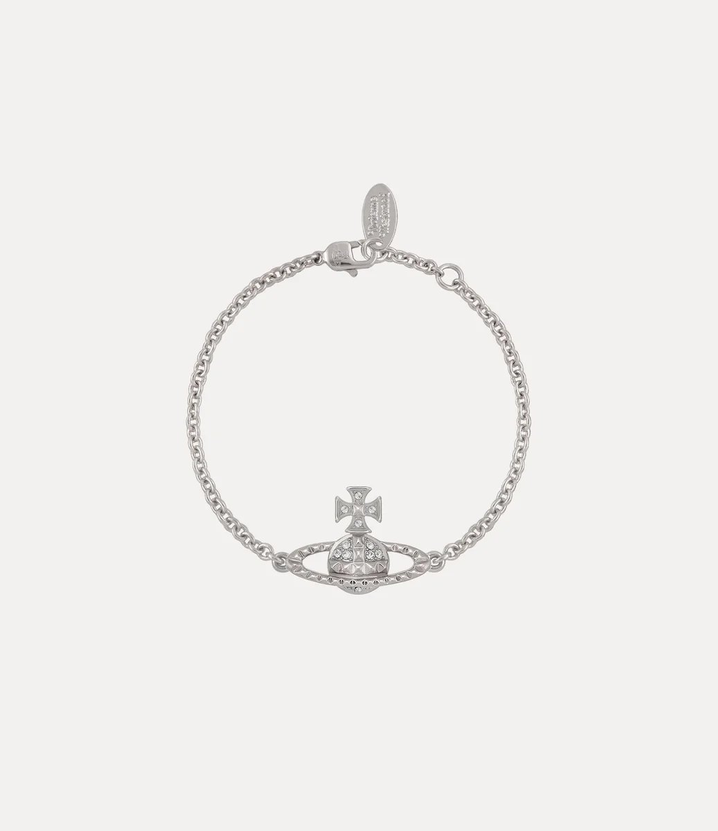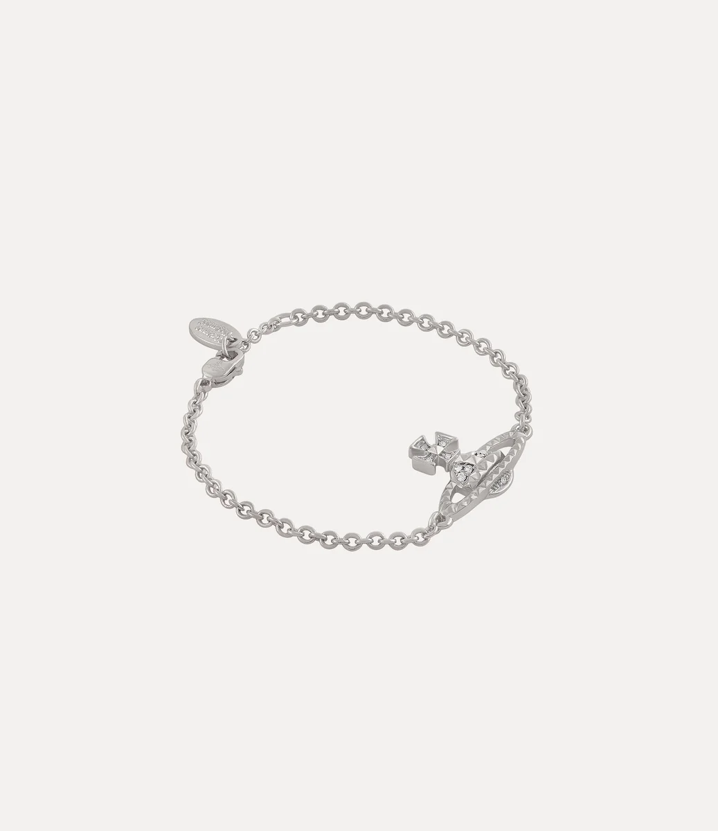 Our Mayfair Bas Relief bracelet has been reimagined this season, complete with silver-tone plating and white crystal embellishments. The piece is named after the Mayfair district in London which Vivienne was fond of. It features pyramid stud details and our bas relief orb – synonymous with Vivienne’s vision of taking tradition into the future.