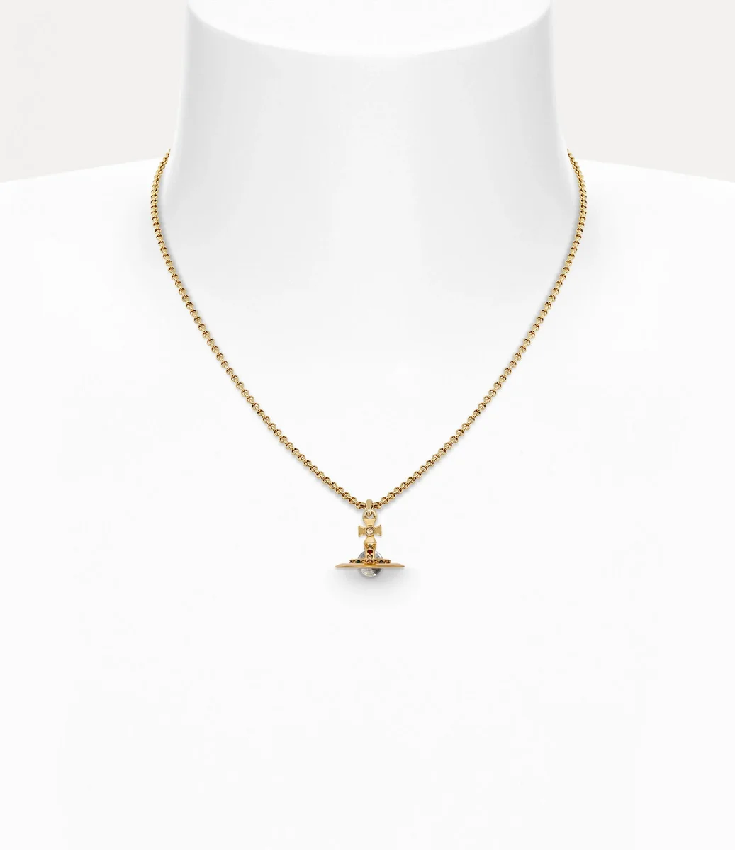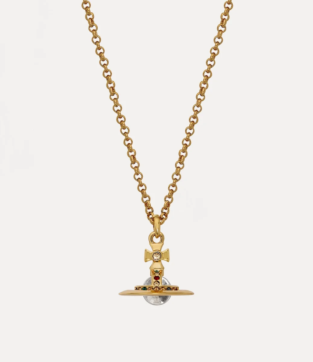 Our New Petite Orb Pendant necklace has been updated this season with gold-tone plating. Encrusted with glistening coloured crystal details, the design incorporates our signature three-dimensional orb in the centre of the chain – synonymous with Vivienne’s vision of launching tradition into the future.