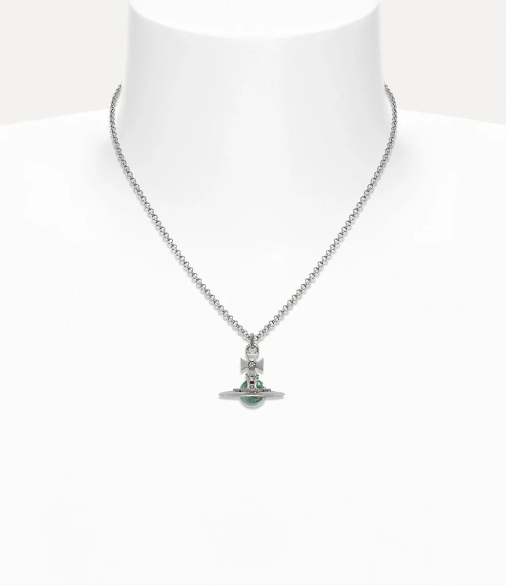 Vivienne Westwood New Tiny Orb Pendant necklace features the classic orb motif with a green spherical glass gemstone, finished with a secure lobster clasp.