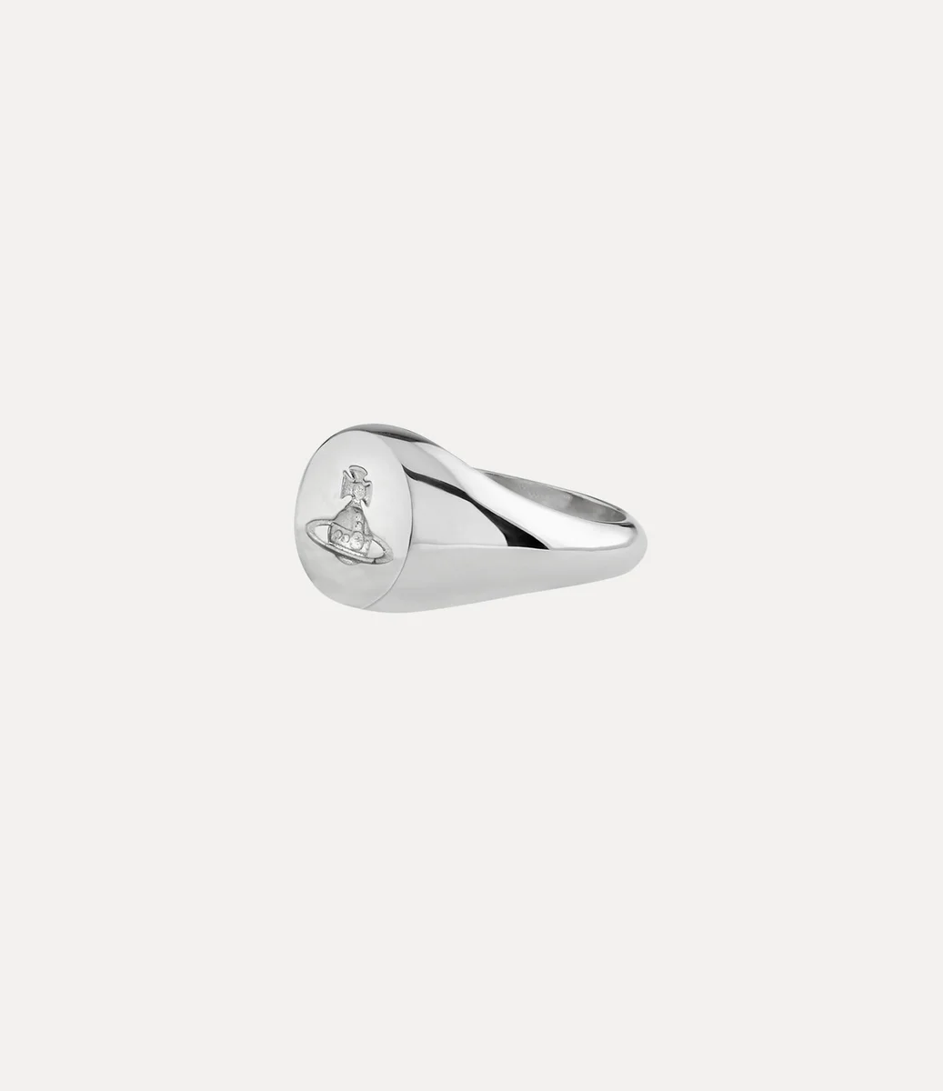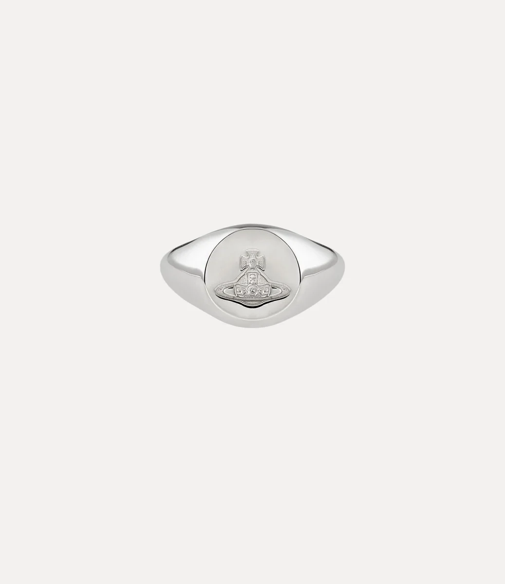 Our Sigillo ring is shaped to a classic signet style, with a reverse intaglio orb carved into the circular face – recalling Vivienne’s vision of launching tradition into the future. The interior section of the band is intricately engraved with textured detailing, complemented by a sleek platinum-plated finish.