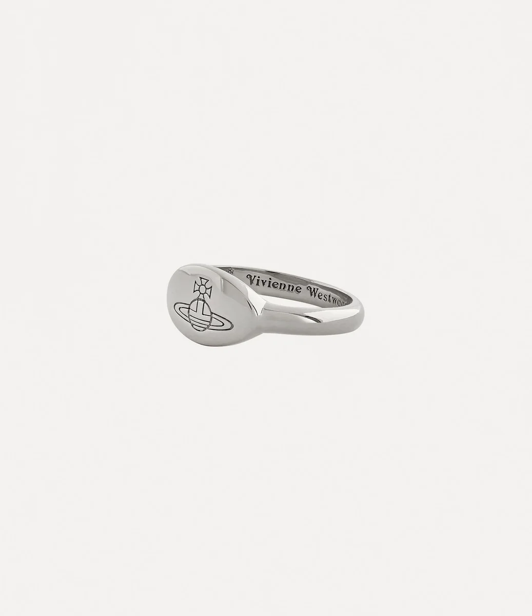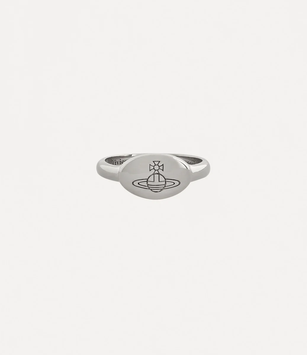 Our Tilly ring features a classic signet silhouette, crafted from recycled silver and finished with polished platinum-tone plating. At its centre, the engraved orb motif is hand-painted with black enamel detailing, echoing Vivienne’s vision of propelling tradition into the future.