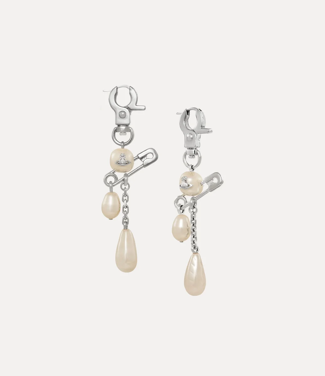 The silver-tone Claude Long earrings feature an orb-embellished pearl in the centre of the design, pierced with a safety pin detail – a nod to Vivienne’s punk aesthetic. The piece offers a drop silhouette, complete with a hardware-inspired clasp and a secure hinged post.