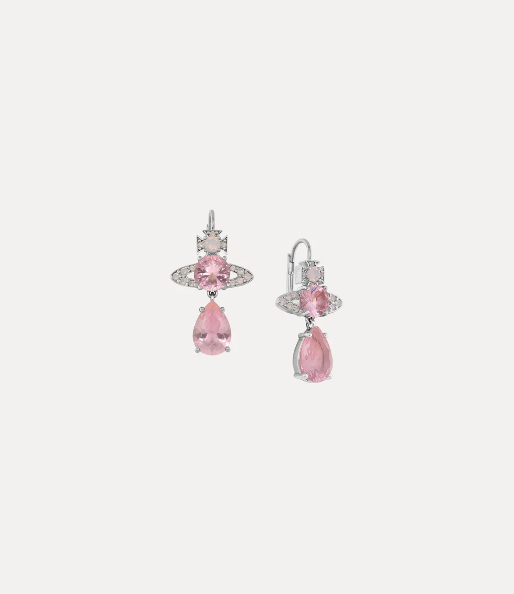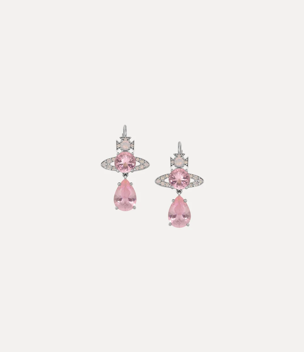 Our Ismene Drop earrings are crafted from silver-tone metal, featuring a faceted pink gemstone at the centre of each orb and a teardrop-shaped stone suspended below. The Saturn ring is embellished with delicate pink crystals, while the cross at the top is adorned with a milky, iridescent gemstone detail.