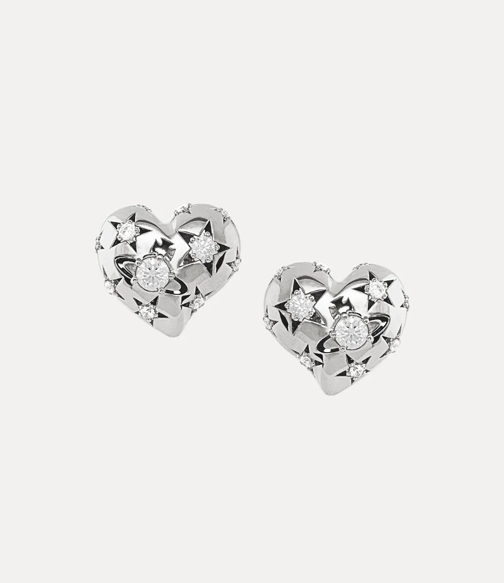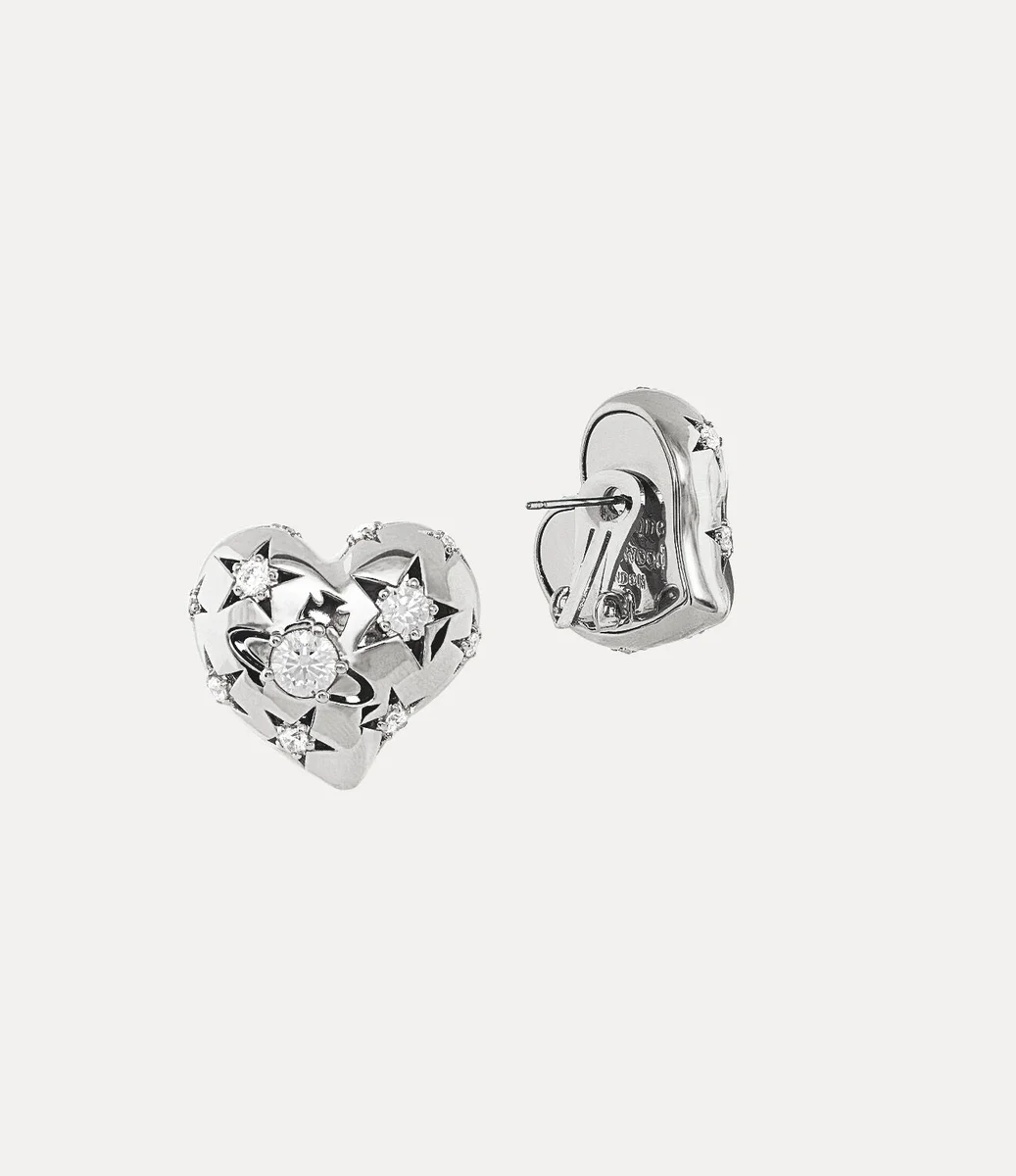 Our silver-tone Lee Clip earrings revive signature iconography of the house, adorned with a classic asymmetrical heart-shaped motif. The design offers an air of celestial charm, featuring star motifs alongside the central orb silhouette, inspired by our orb-shaped motif, recalling Vivienne’s vision of taking tradition into the future.