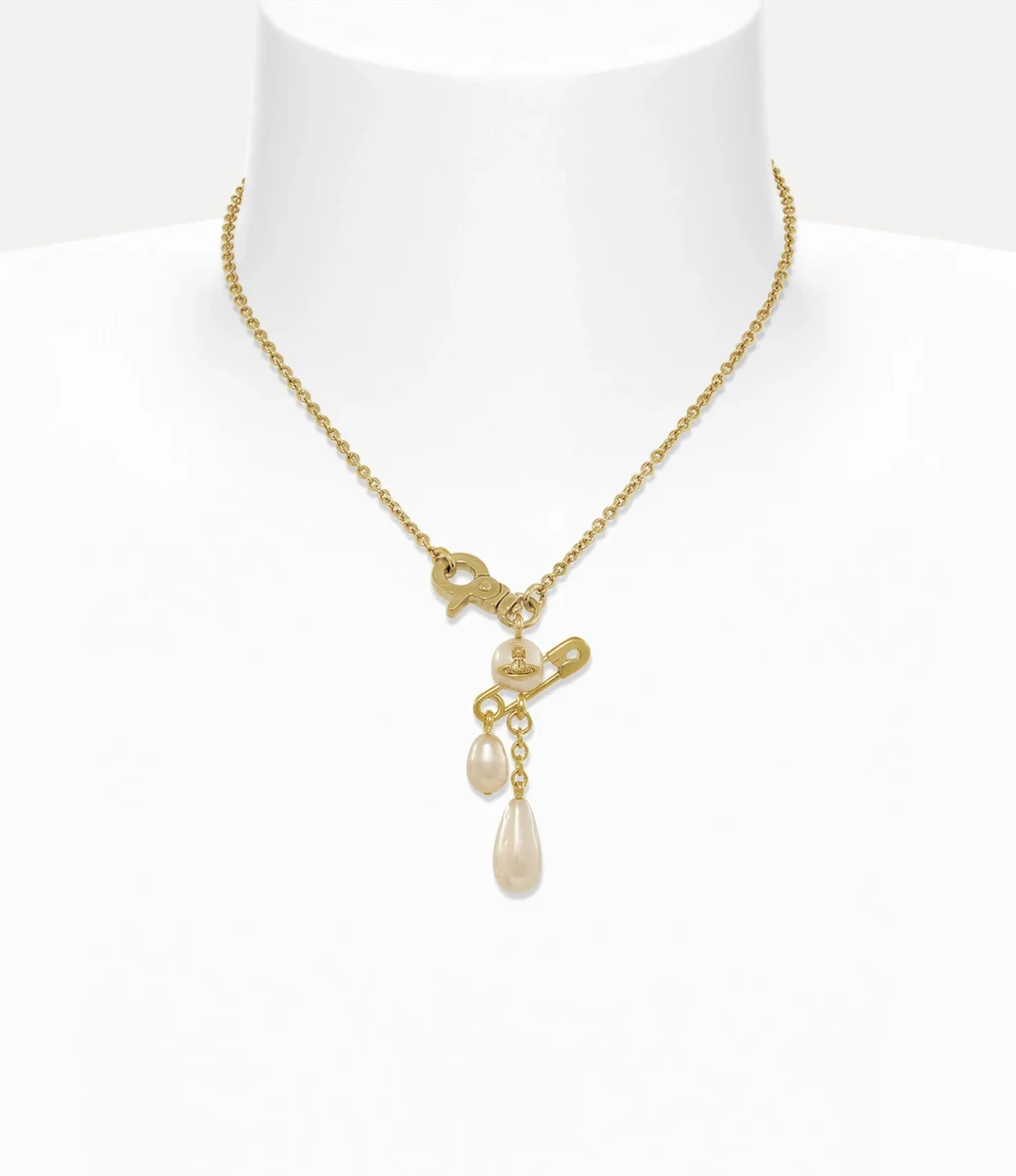 Vivienne Westwood Claude Small necklace in gold-toned plating, features a rounded pearl with a central orb, accented by a signature safety pin detail.