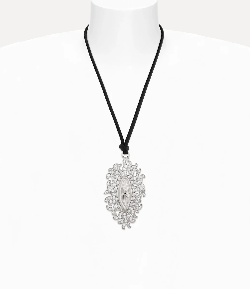 The Floriana Pendant necklace draws inspiration from the house’s iconic ‘Vagina’ motif, first introduced on the Andreas Kronthaler for Vivienne Westwood Autumn–Winter 2019/2020 runway. The bold motif, adorned with white crystals, hangs from an adjustable black Italian leather cord and echoes Vivienne’s admiration for ancient art, where it was often associated with themes of fertility or strength.