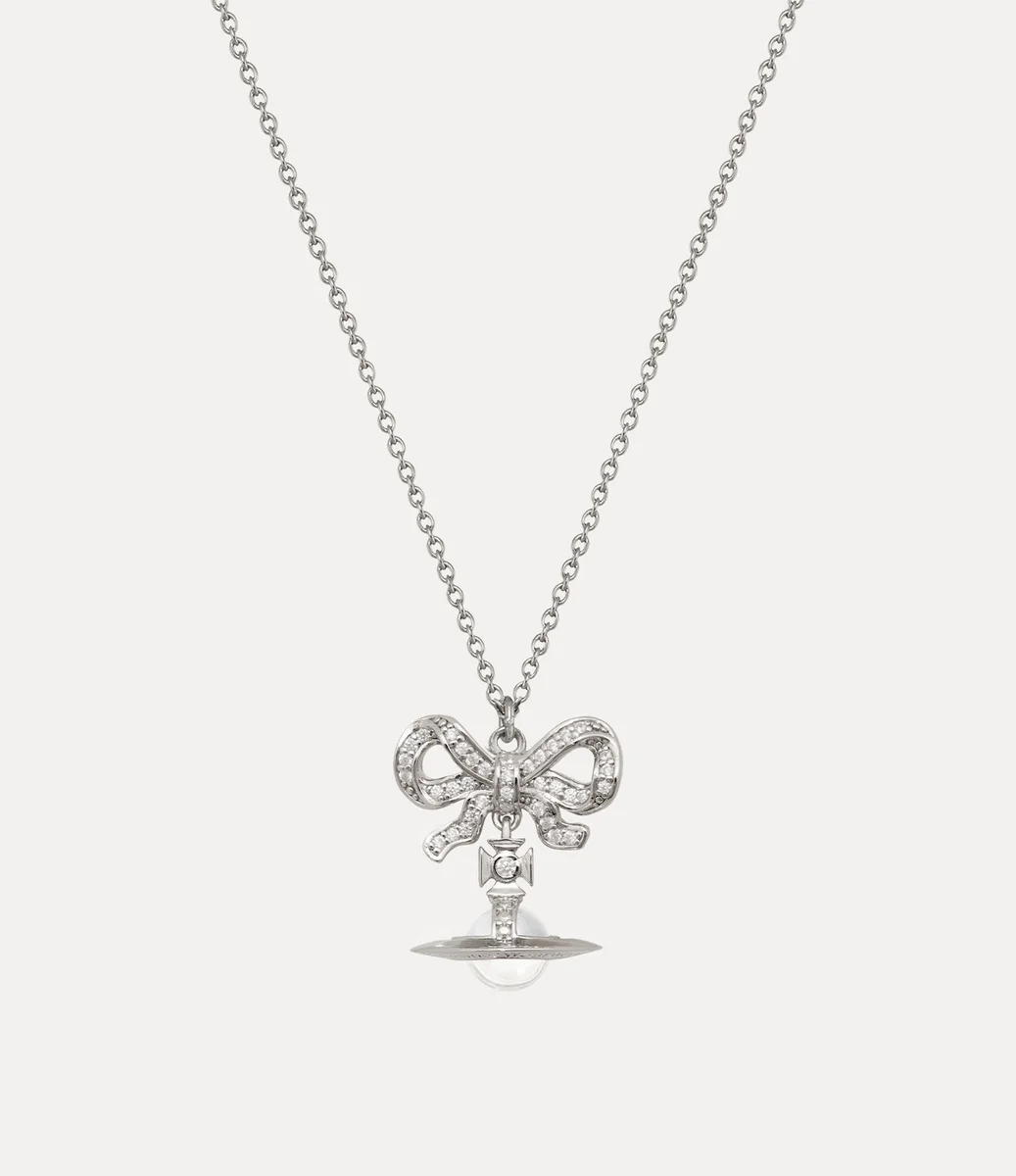 Our Octavie Pendant necklace is crafted from recycled silver and finished with polished platinum-tone plating. Embellished with sparkling white crystals, the design combines a Georgian-style bow with our signature three-dimensional orb at the centr, echoing the house’s classic orb motif.