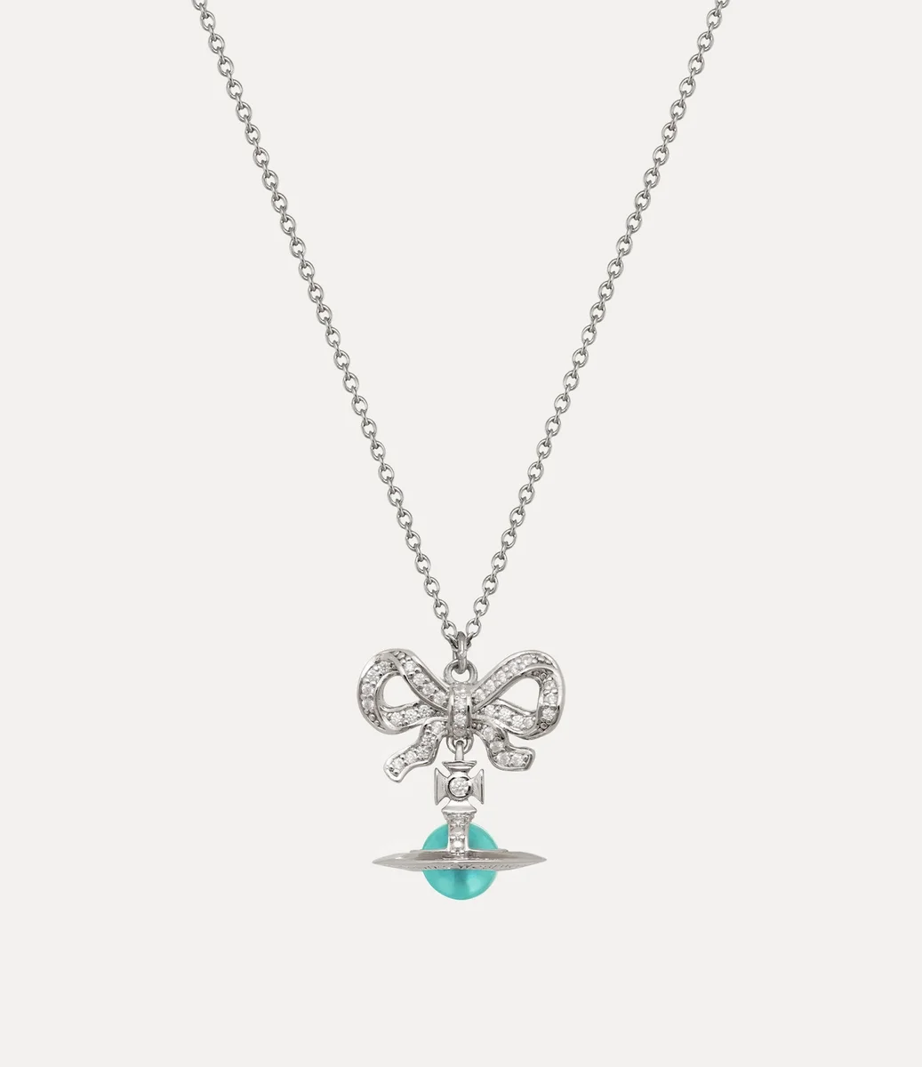 Our Octavie Pendant necklace is crafted from recycled silver and finished with polished platinum-tone plating. Embellished with sparkling white crystals, the design combines a Georgian-style bow with our signature three-dimensional orb at the centre, rendered in a turquoise finish, echoing the house’s classic orb motif.