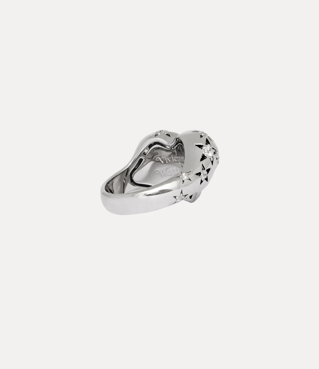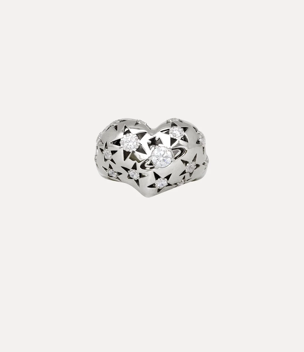 Our Lee ring is sculpted from recycled silver and finished with a radiant platinum-tone plating. The face takes the form of an asymmetric heart, a nod to Vivienne’s affection for humanity and the planet, complete with a crystal-encrusted stars and orb motifs scattered across its surface.